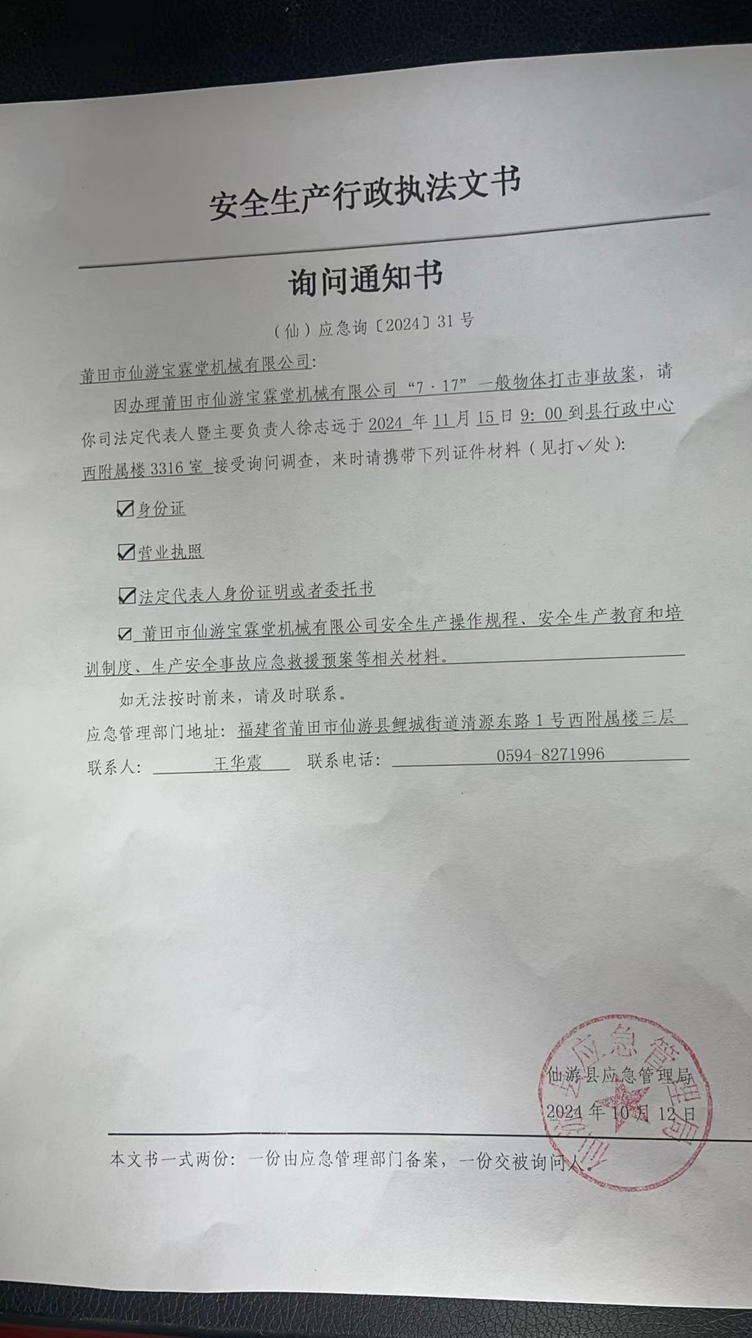 因办理莆田市仙游宝霖堂机械有限公司“7·17”一般物体打击事故案,我局执法人员多次前往你司,并通过拨打你司法定代表人(主要负责人徐志远)电话、短信发送、邮寄的方式均无法送达《询问通知书》。故我局无法通过直接送达及邮寄送达方式向你司送达《询问通知书》。