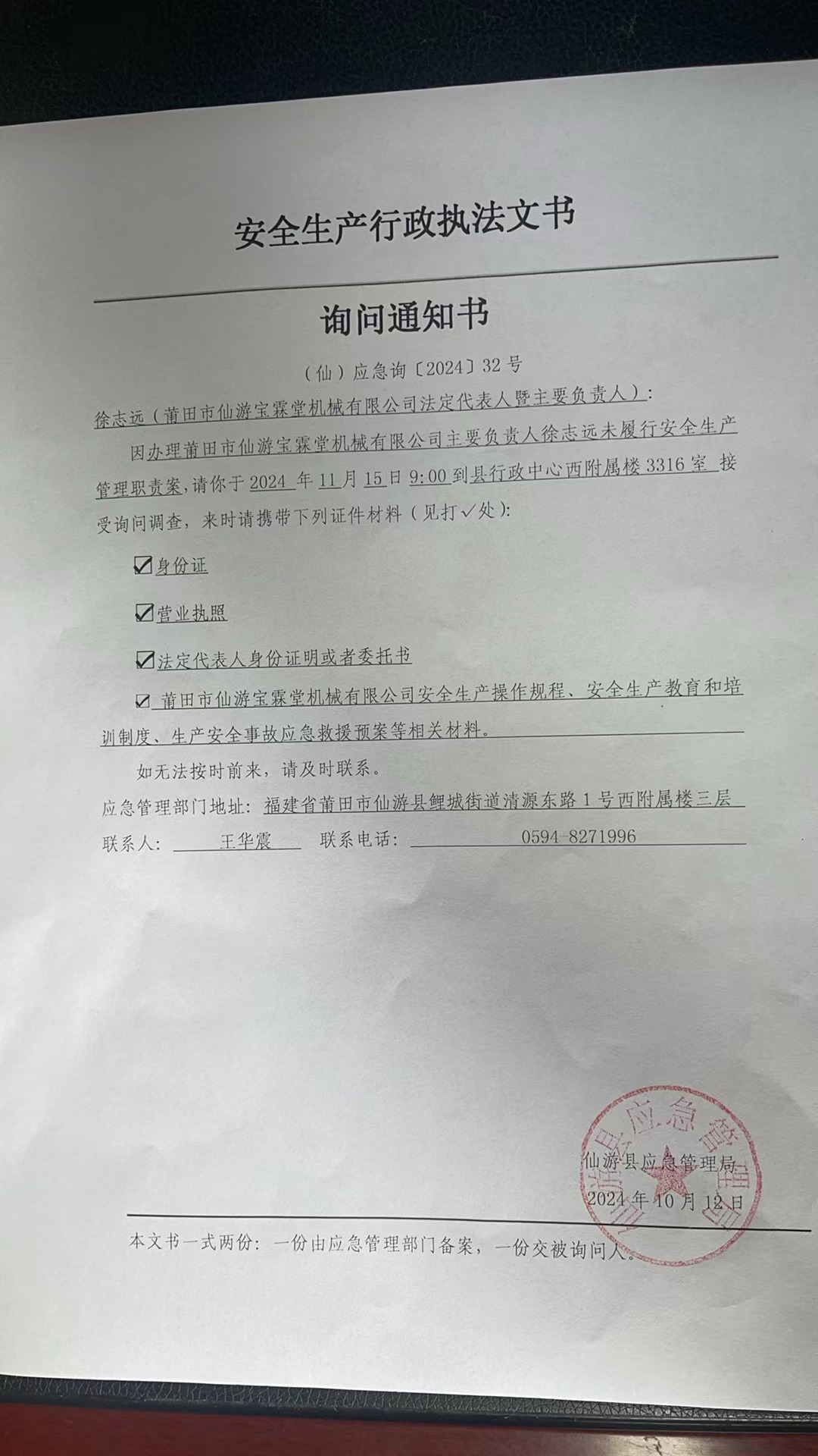 因办理莆田市仙游宝霖堂机械有限公司法定代表人及主要负责人徐志远未履行安全生产管理职责案,我局执法人员多次前往你司,并通过拨打你个人电话、短信发送、邮寄的方式均无法送达《询问通知书》。故我局无法通过直接送达及邮寄送达方式向你送达《询问通知书》。