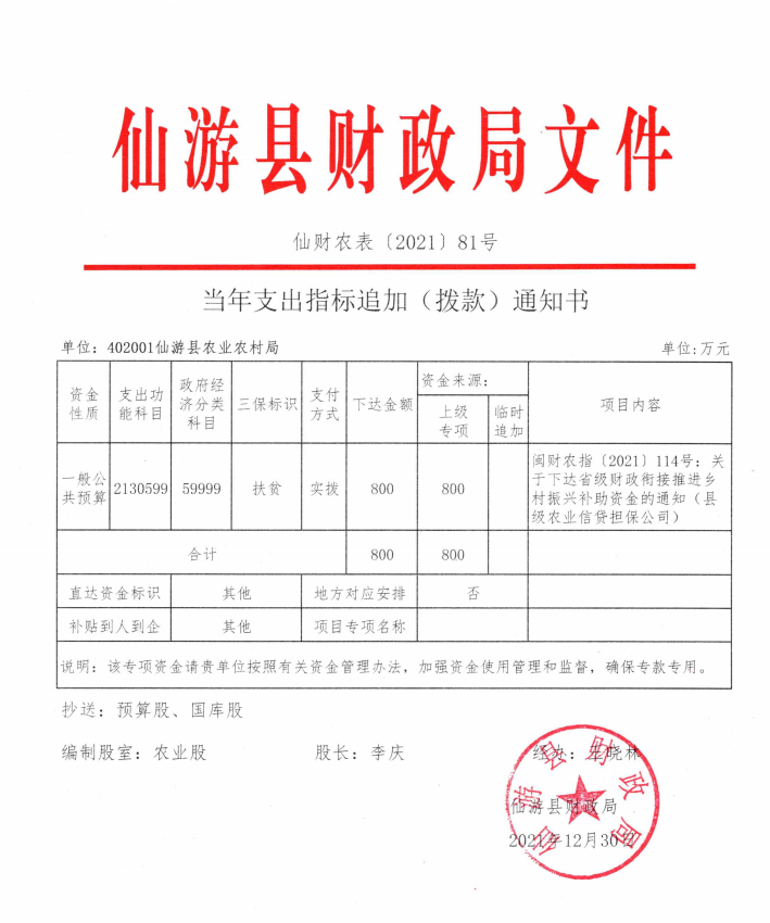 根据福建省财政厅 福建省农业农村厅《关于下达省级财政衔接推进乡村振兴补助资金的通知》(闽财农指〔2021〕114号),为做好巩固拓展脱贫攻坚成果同乡村振兴有效衔接,更好发挥县级农业信贷担保公司作用,现下达上级专项补助资金800万元至县农业农村局,专款用于我县农业信贷担保公司开展工作,引导更多资本投入乡村振兴建设,加快推动农业农村现代化进程。