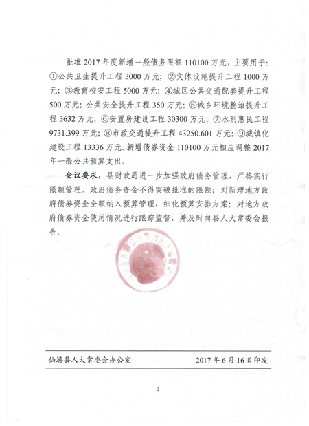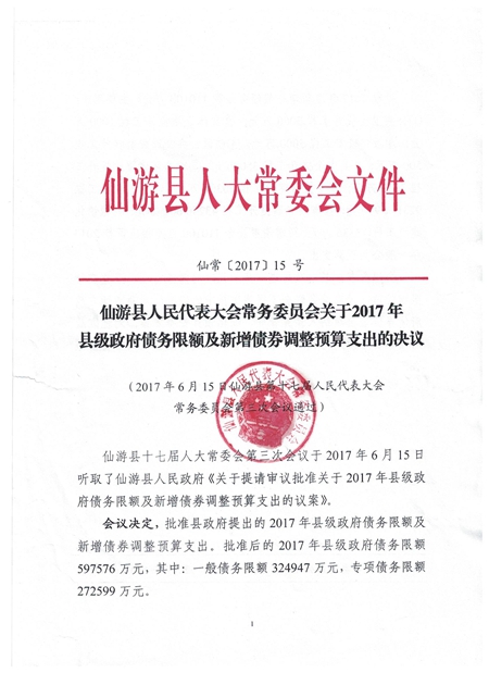 仙游县人民代表大会常务委员会关于2017年县级政府债务限额及新增债券调整预算支出的决议