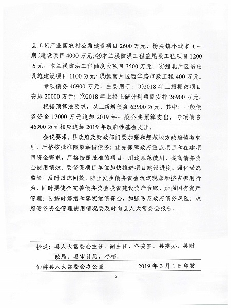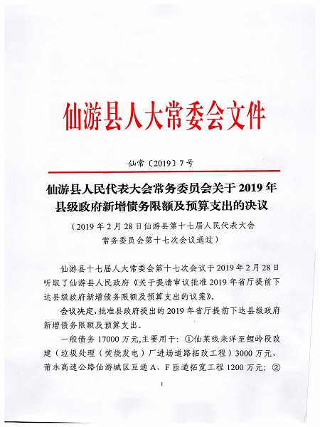 仙游县人民代表大会常务委员会关于2019年县级政府新增债务限额及预算支出的决议