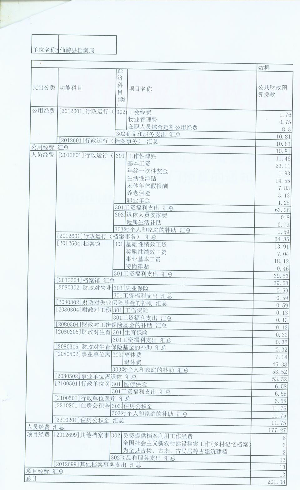 按照预算管理有关规定,目前部门预算的编制实行综合预算制度,全部收入和支出都反映在预算中。2016年,仙游县档案局收入预算为201.08万元,其中:当年财政拨款收入201.08万元。相应安排支出预算201.08万元,其中:人员支出110.41万元,对个人和家庭补助支出66.86万元,公用支出10.81万元,项目支出13万元。