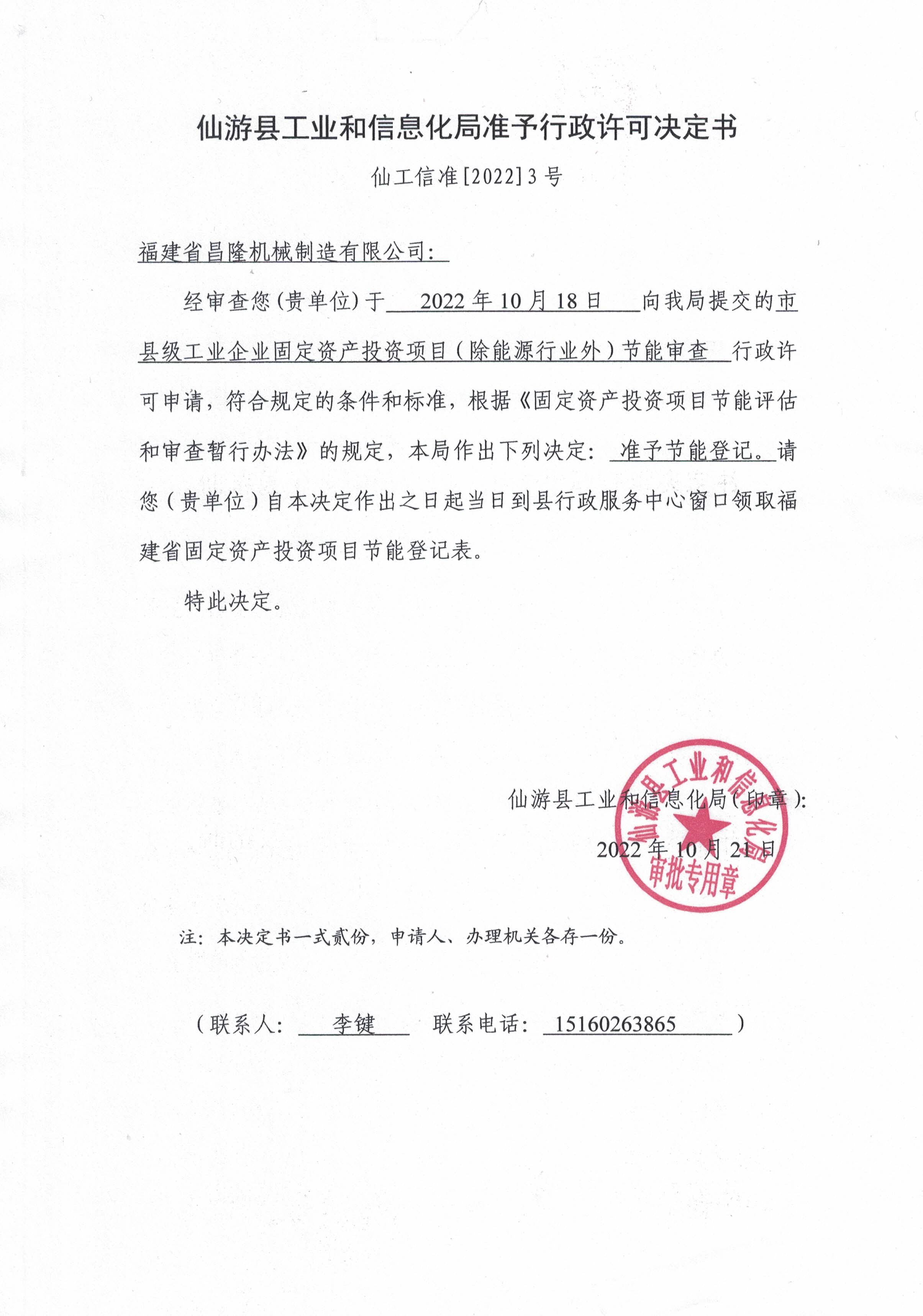 仙游县工业和信息化局准予行政许可决定书(仙工信准[2022]3号)
