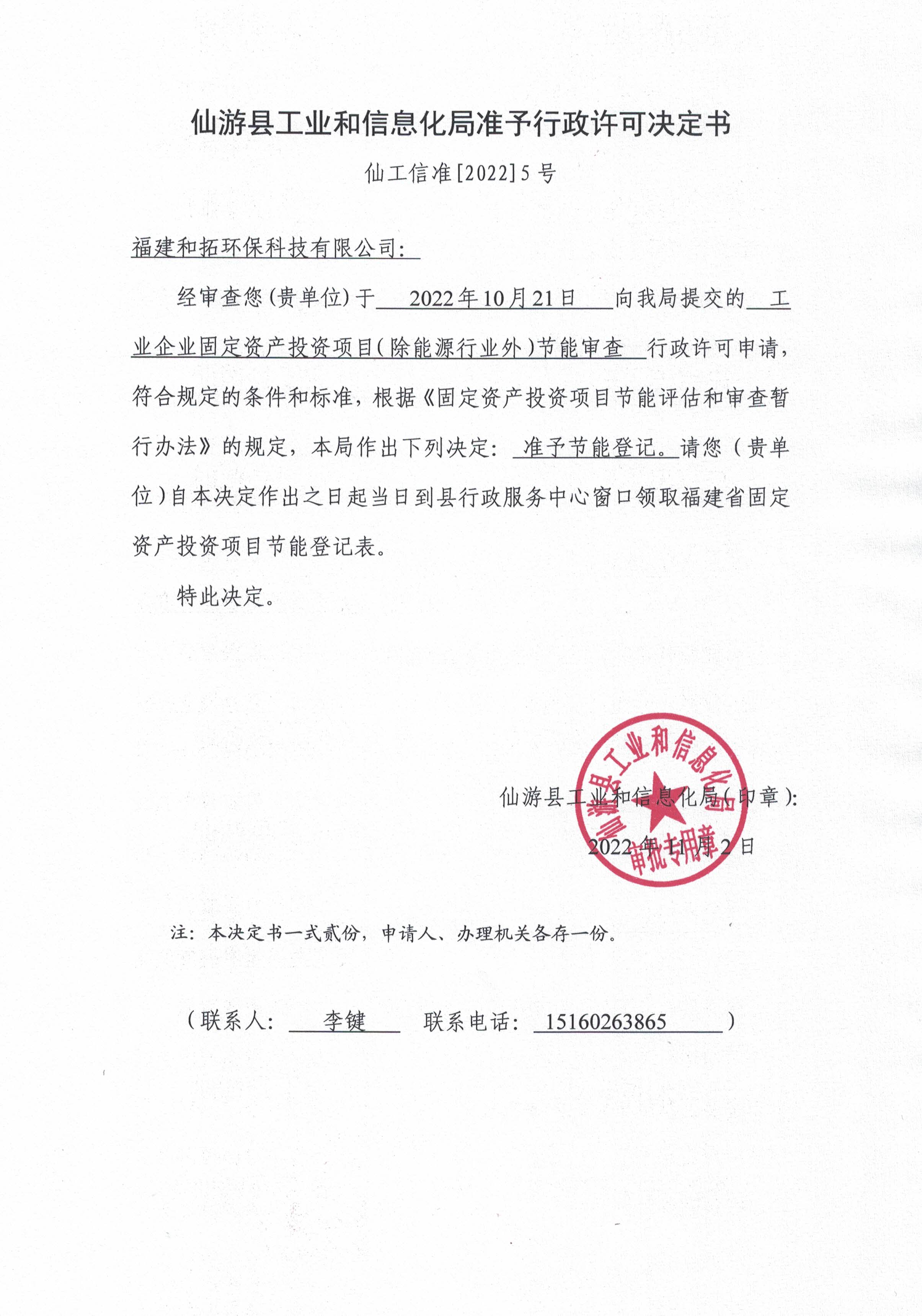 20221102仙游县工业和信息化局准予行政许可决定书(仙工信准[2022]5号)