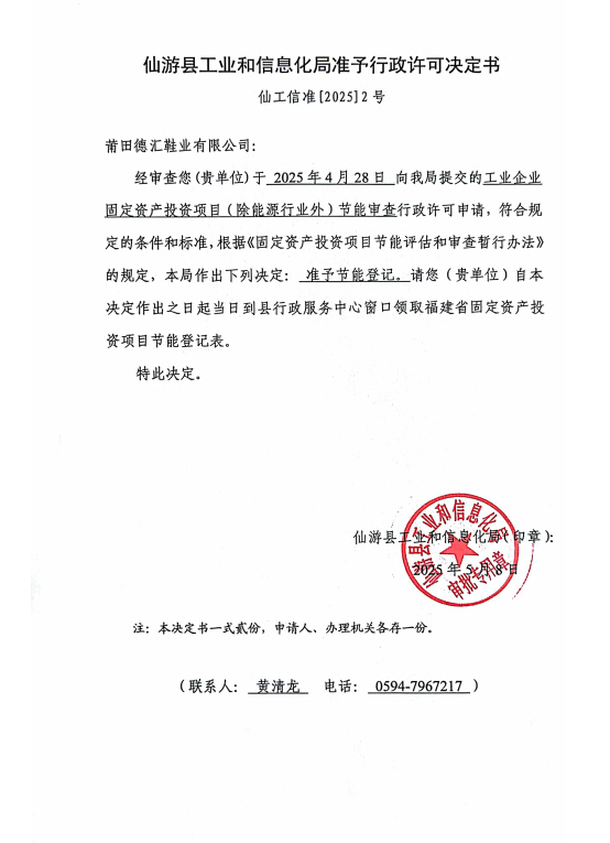 仙游县工业和信息化局准予行政许可决定书(仙工信准[2025]2号)