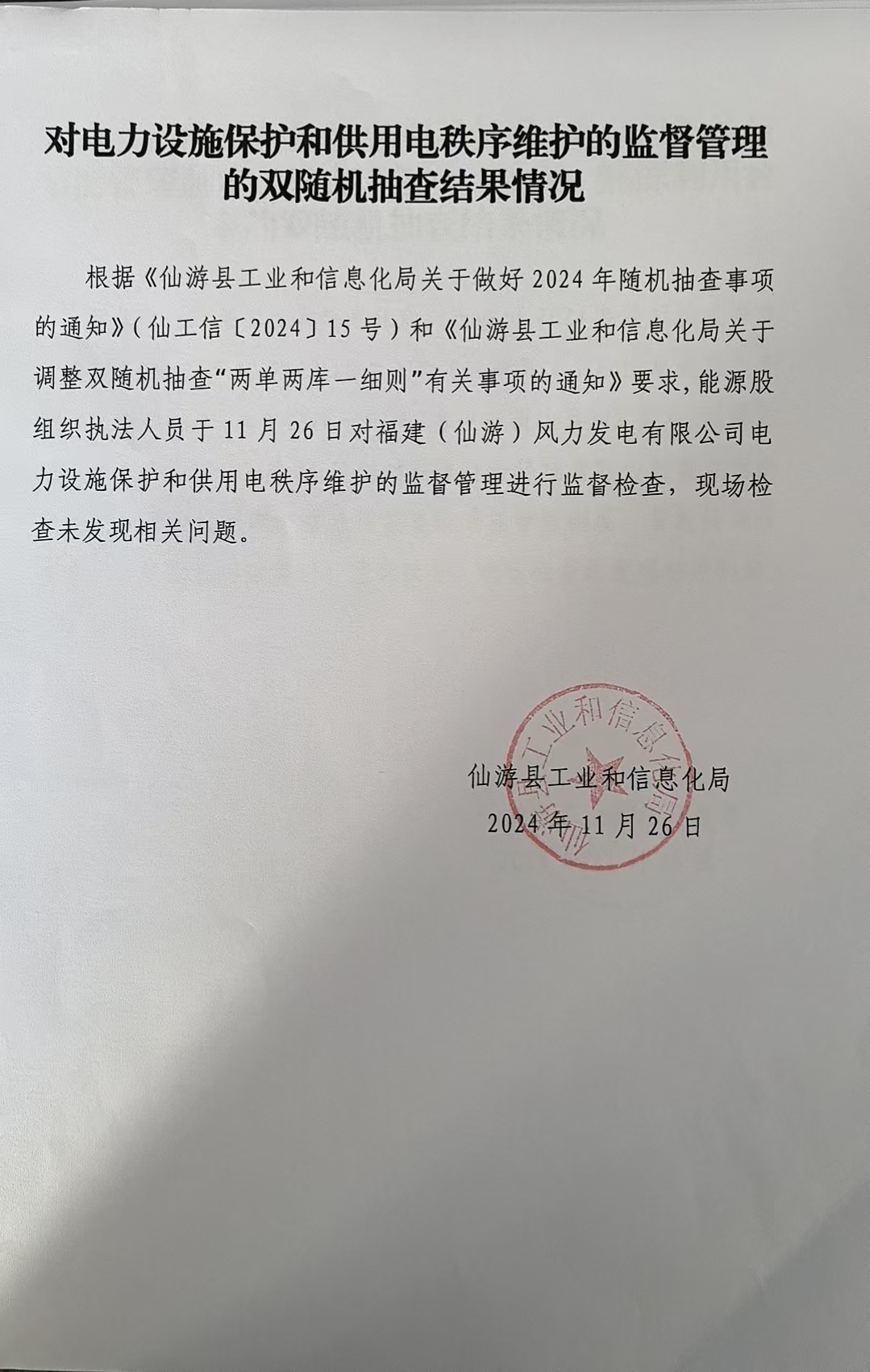 对电力设施保护和供用电秩序维护的监督管理的双随机抽查结果情况