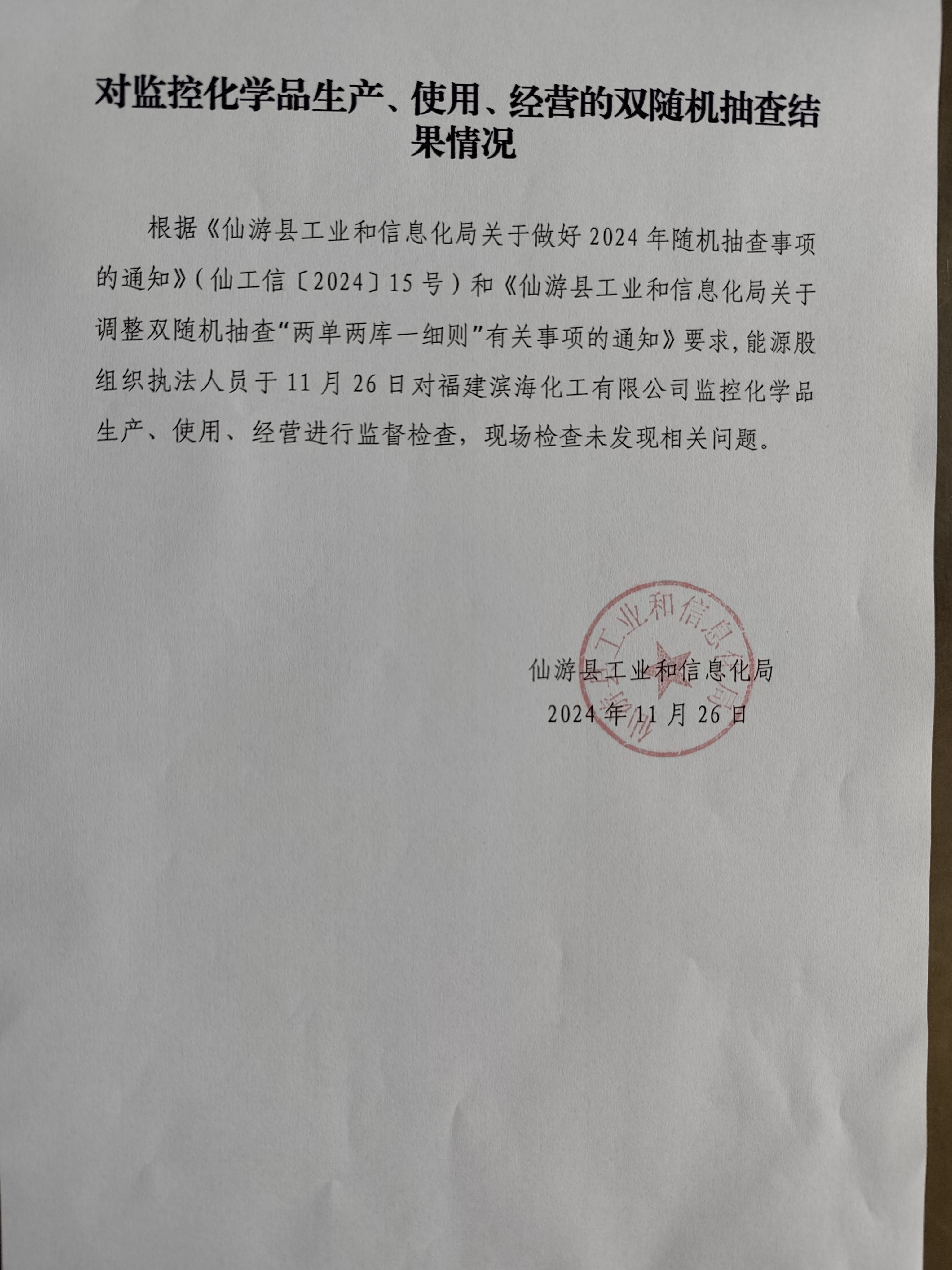 对监控化学品生产、使用、经营的双随机抽查结果情况