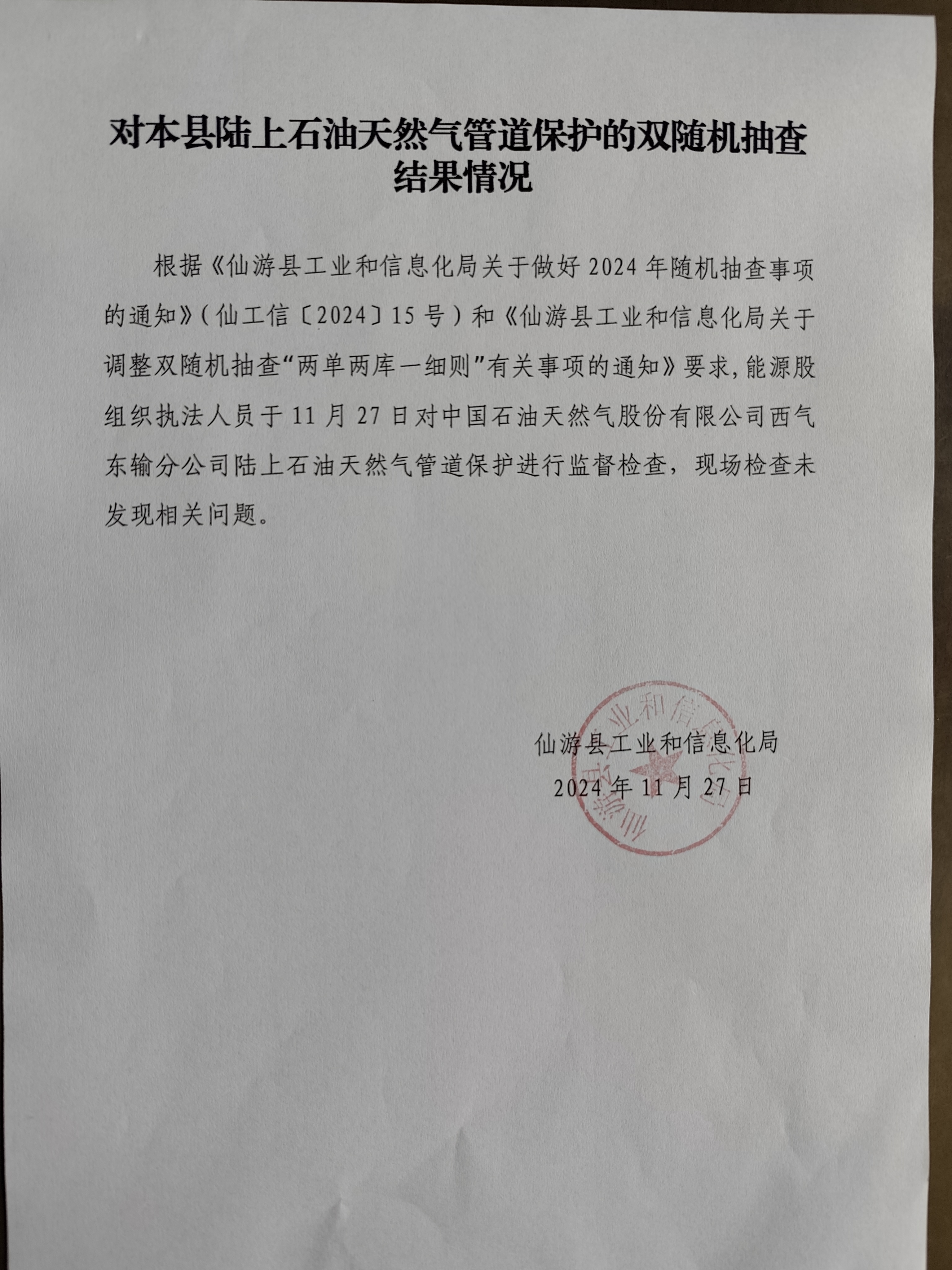 对本县陆上石油天然气管道保护的双随机抽查结果情况