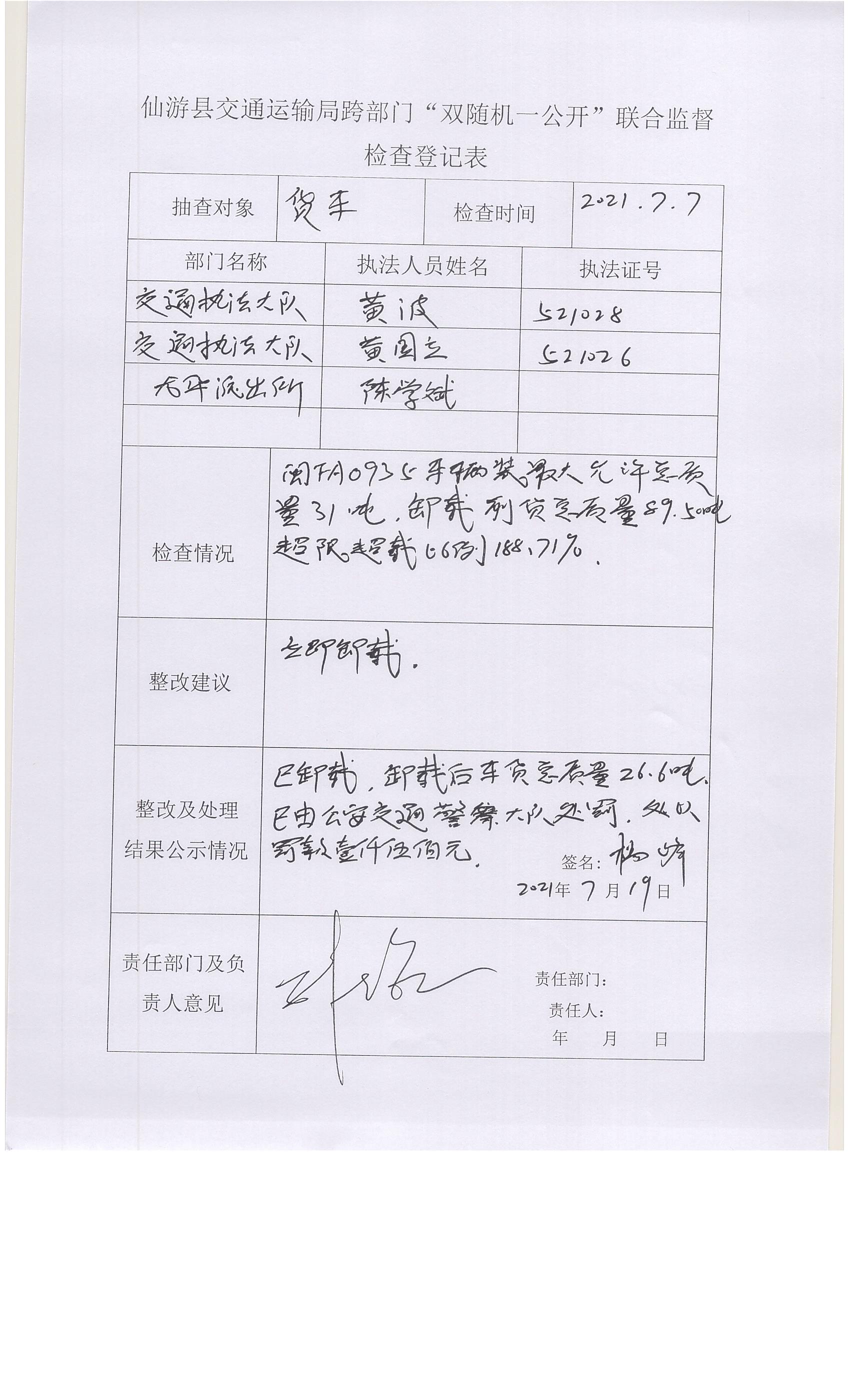 仙游县交通运输局跨部门“双随机 一公开”联合监督检查登记表