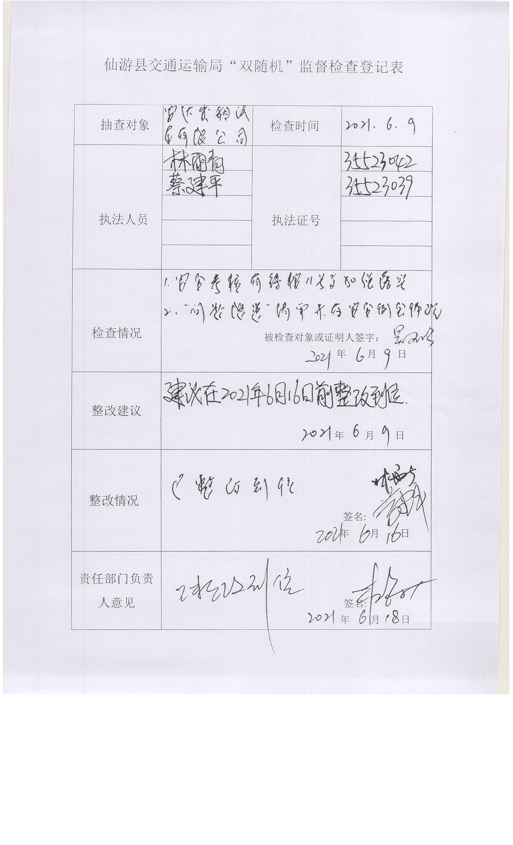 仙游县交通运输局跨部门“双随机 一公开”联合监督检查登记表