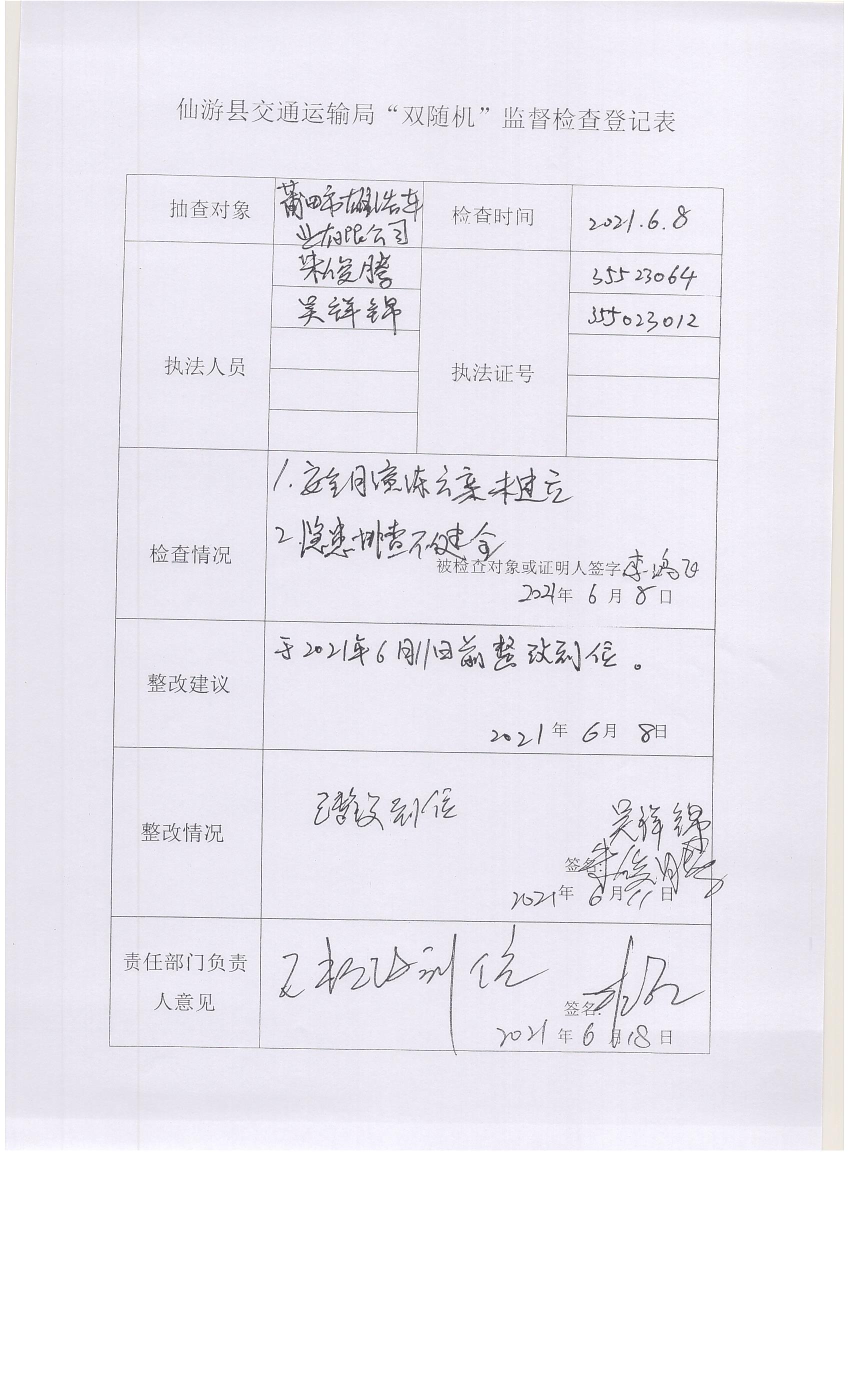 仙游县交通运输局跨部门“双随机 一公开”联合监督检查登记表