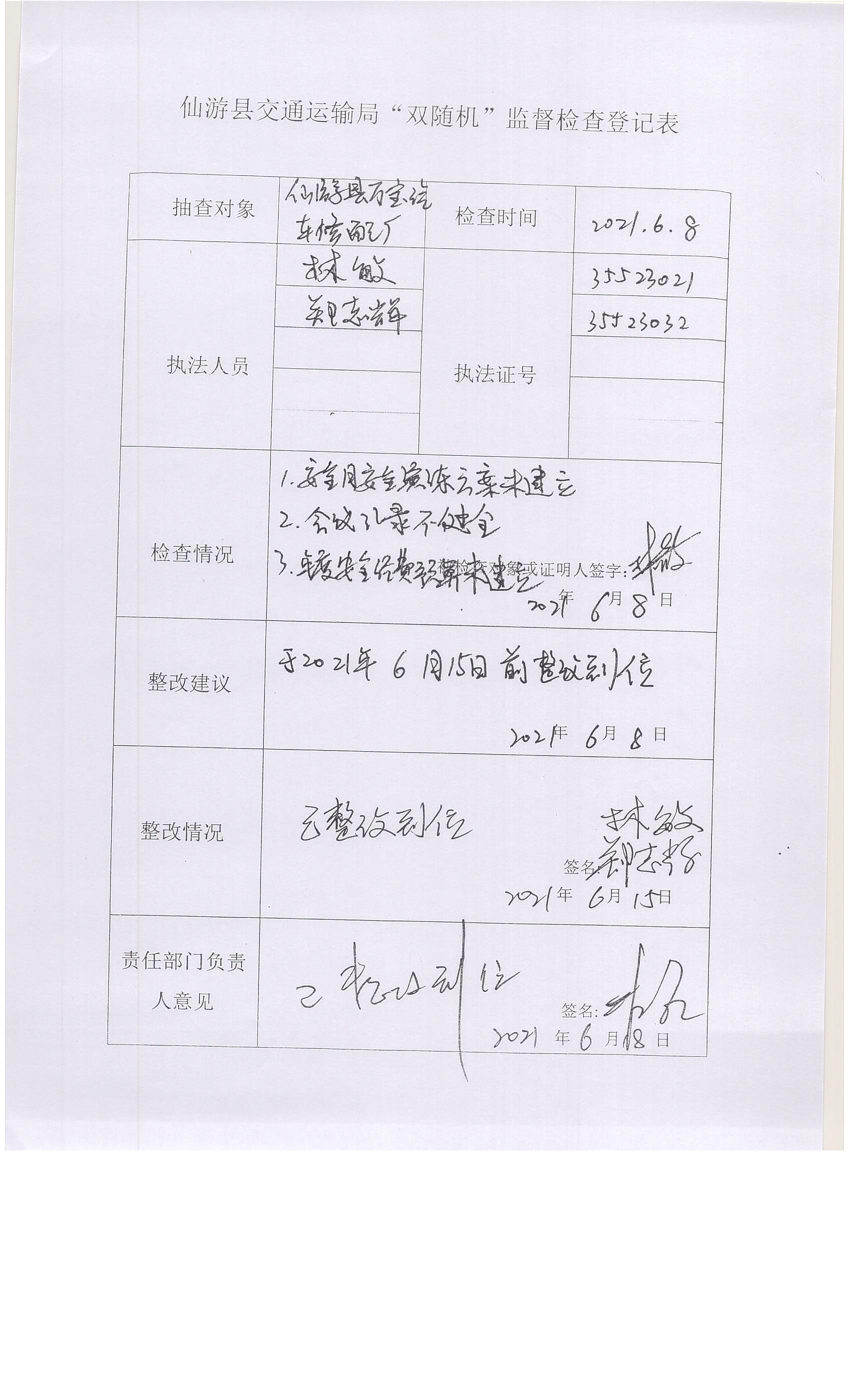 仙游县交通运输局跨部门“双随机 一公开”联合监督检查登记表