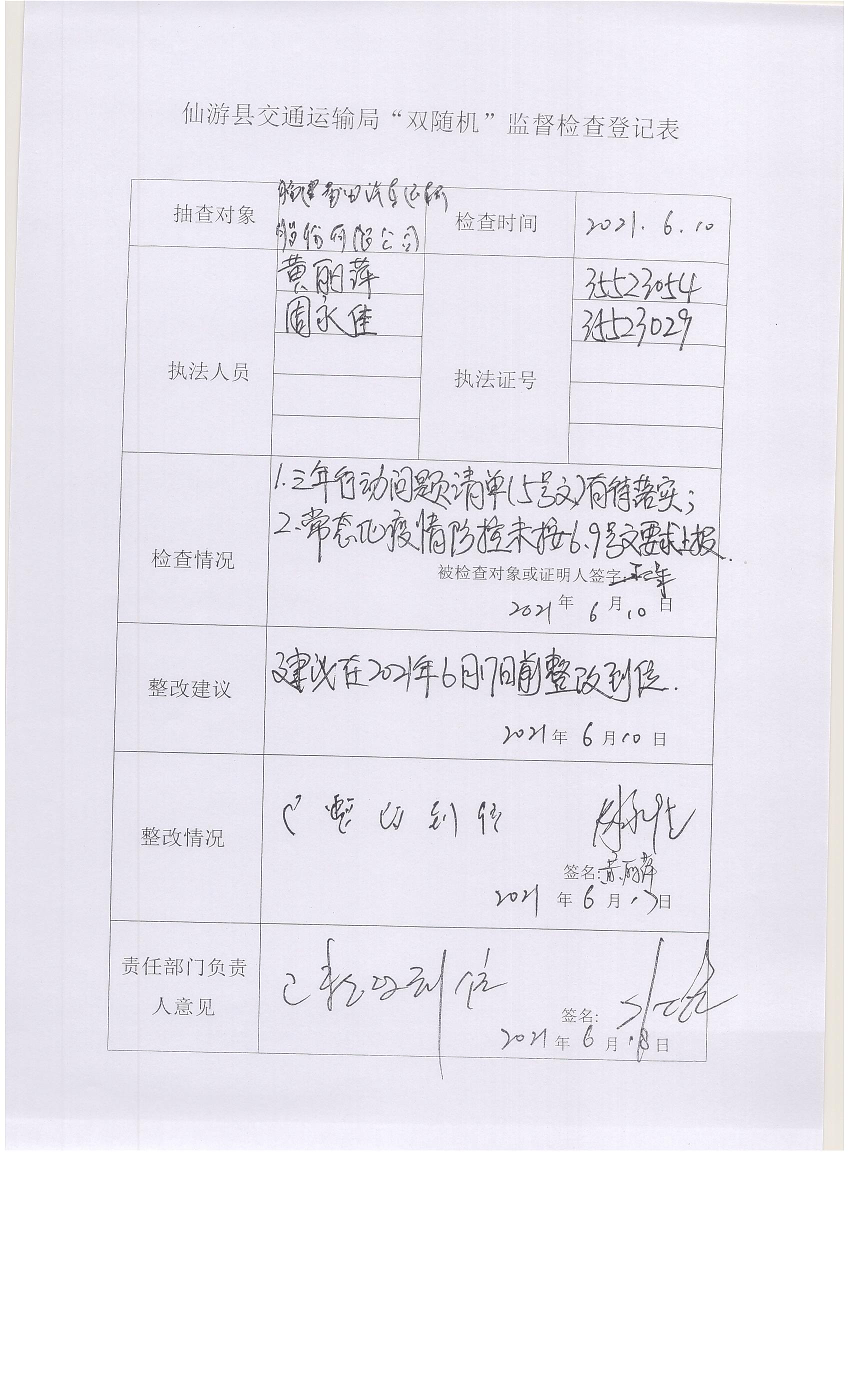 仙游县交通运输局跨部门“双随机 一公开”联合监督检查登记表