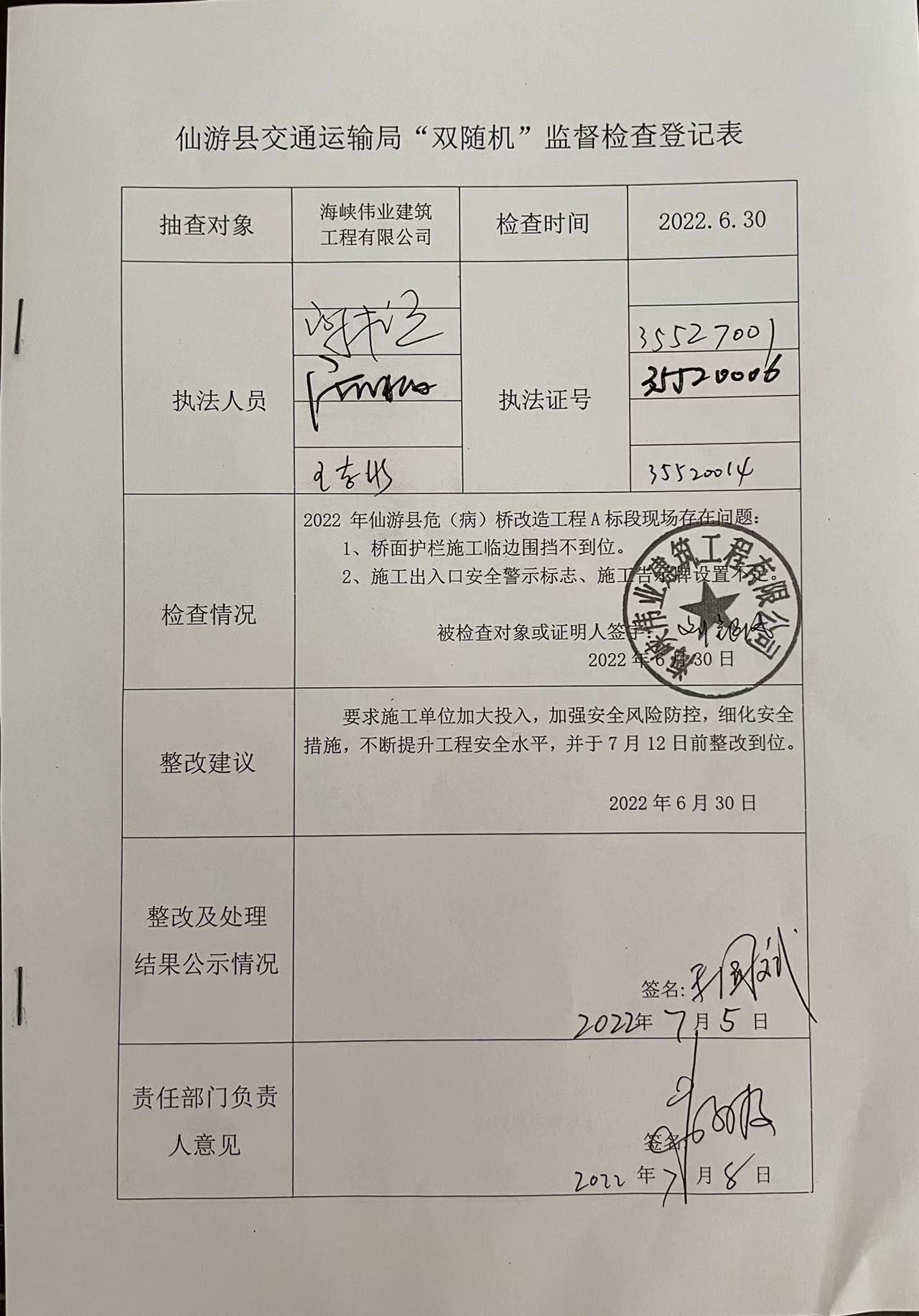 仙游县交通运输局“双随机”监督检查登记表
