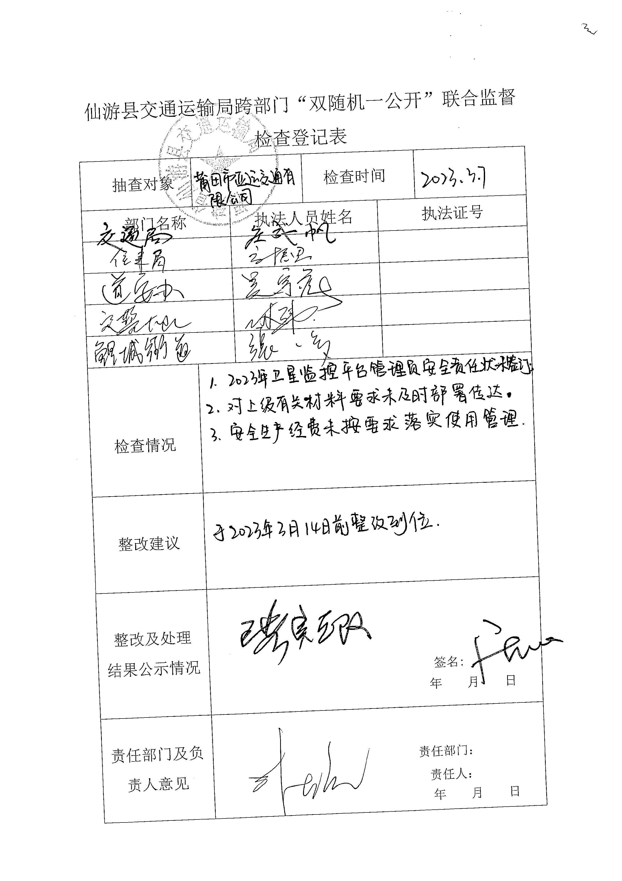 仙游县交通运输局跨部门“双随机 一公开”联合监督检查登记表