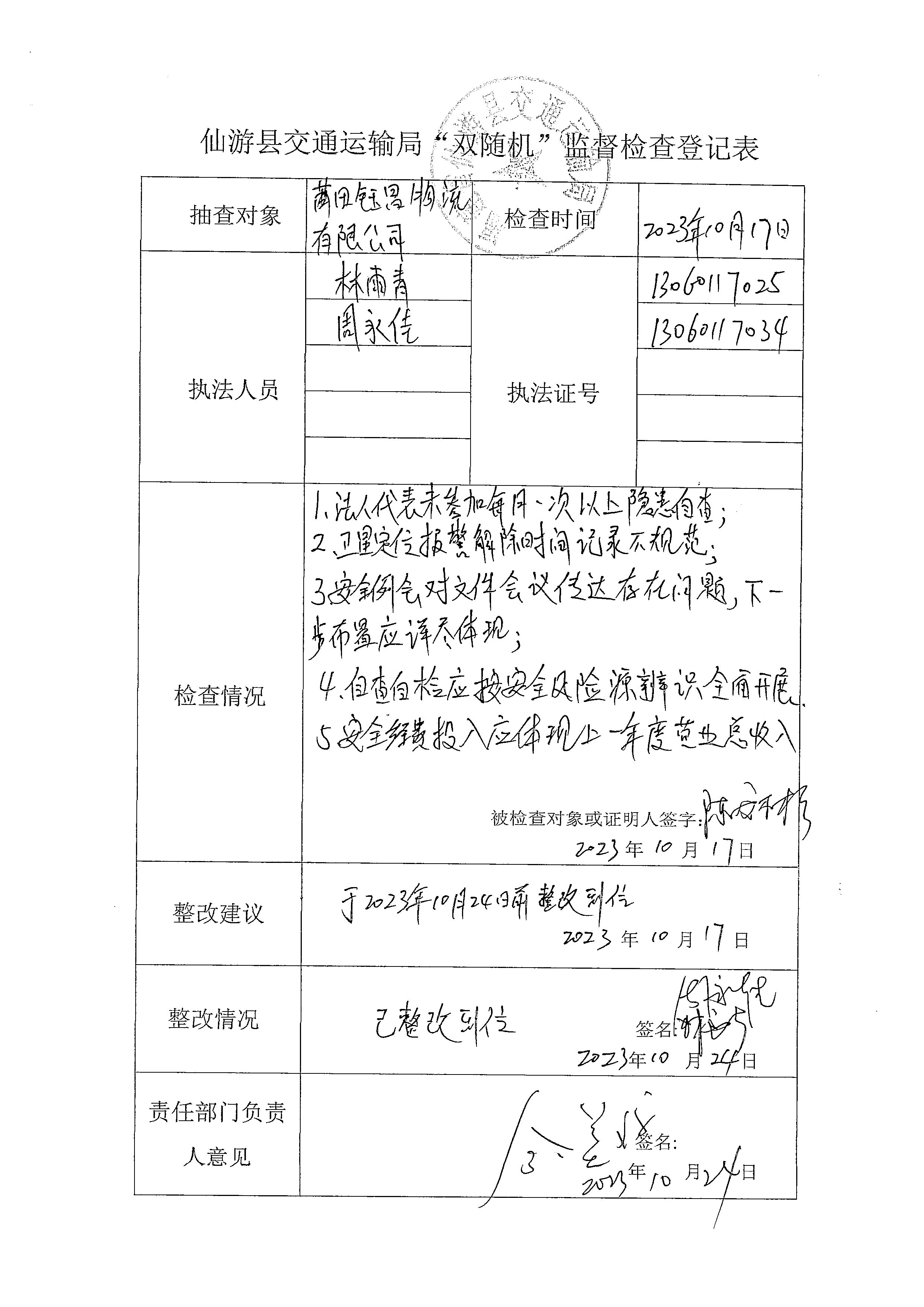仙游县交通运输局“双随机”监督检查登记表