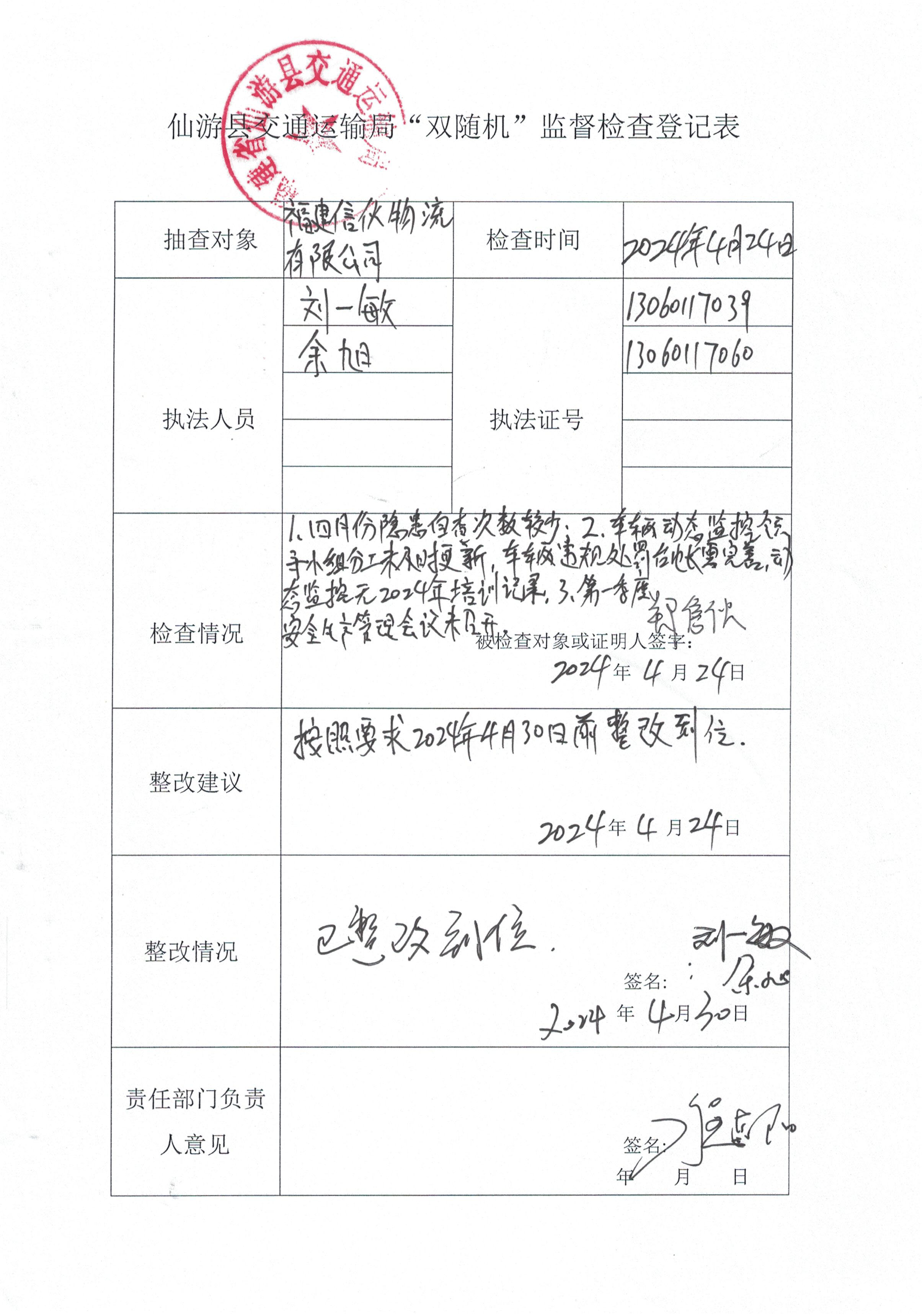 仙游县交通运输局“双随机”监督检查登记表