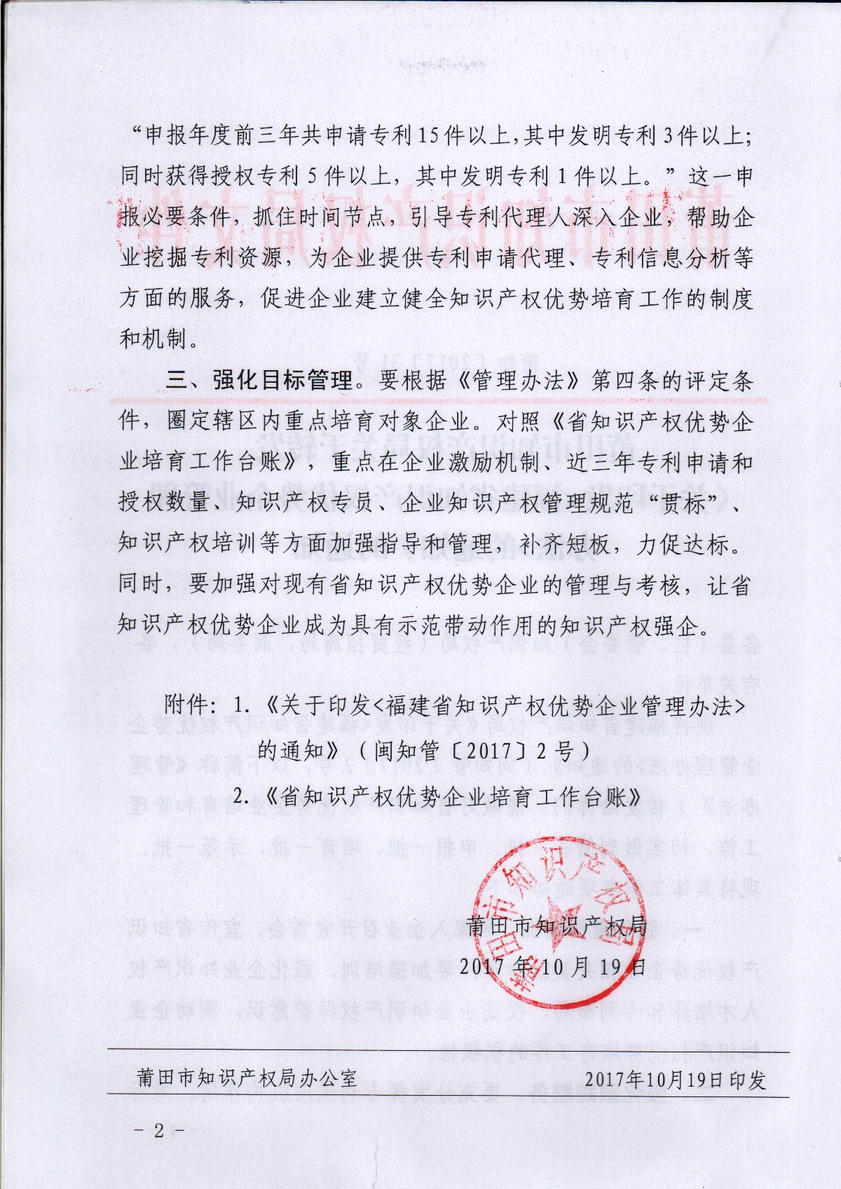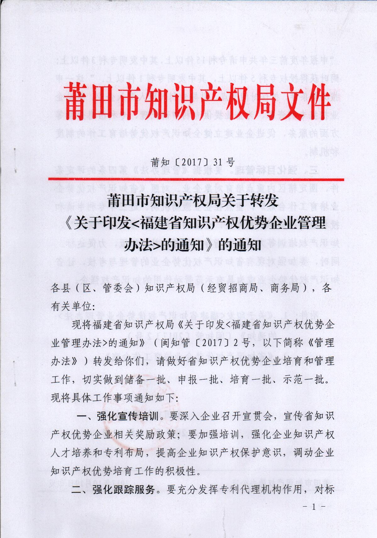 莆田市知识产权局关于转发《关于印发〈福建省知训产权优势企业管理办法〉的通知》的通知