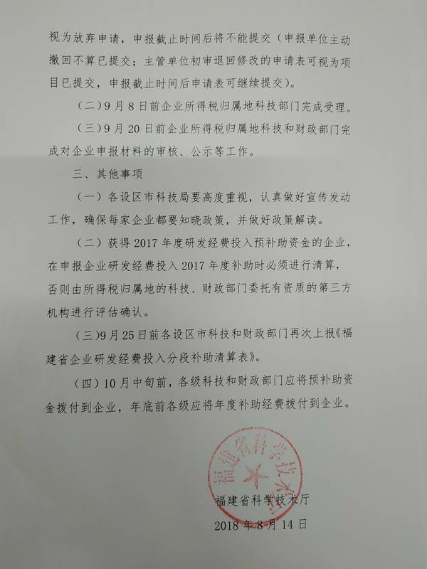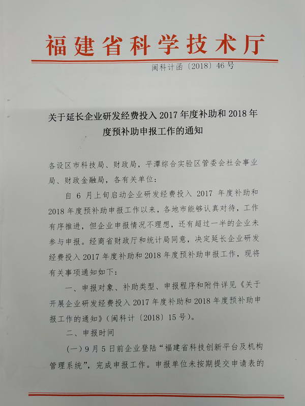 附件:《关于延长企业研发经费投入2017年度补助和2018年度预补助申报工作的通知》(闽科计函[2018]46号)