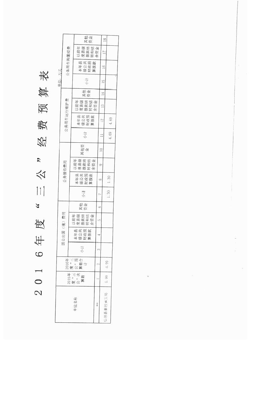 2016年度“三公”经费控制在5.99万元以内,其中:公务接待在1.3万元以内,公务出国在0万元以内,车辆运行经费在4.69万元以内,车辆购置在0万元以内。“三公”经费均在年度安排的支出和上级补助中列支。