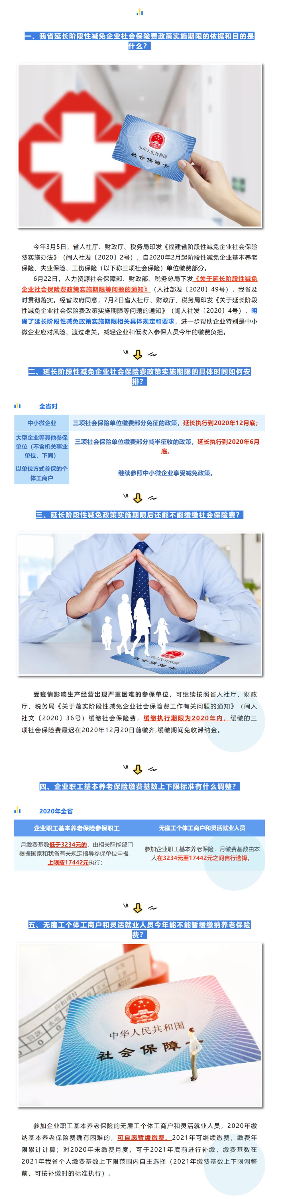 6月22日,人力资源社会保障部、财政部、税务总局下发《关于延长阶段性减免企业社会保险费政策实施期限等问题的通知》(人社部发〔2020〕49号),我省及时贯彻落实。经省政府同意,7月2日省人社厅、财政厅、税务局印发《关于延长阶段性减免企业社会保险费政策实施期限等问题的通知》(闽人社发〔2020〕4号),明确了延长阶段性减免政策实施期限相关具体规定和要求,进一步帮助企业特别是中小微企业应对风险、渡过难关,减轻企业和低收入参保人员今年的缴费负担。