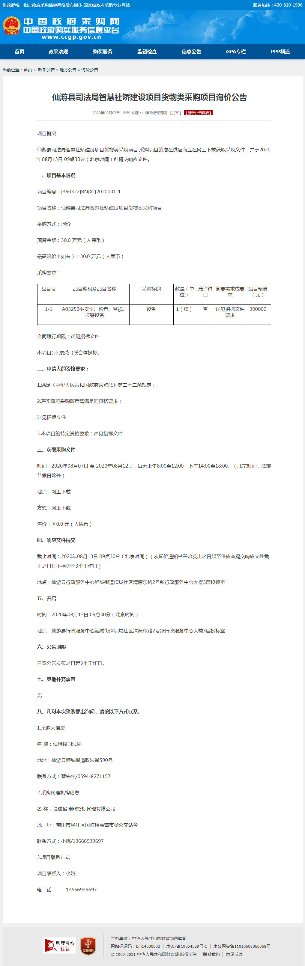 仙游县司法局智慧社矫建设项目货物类采购项目询价公告