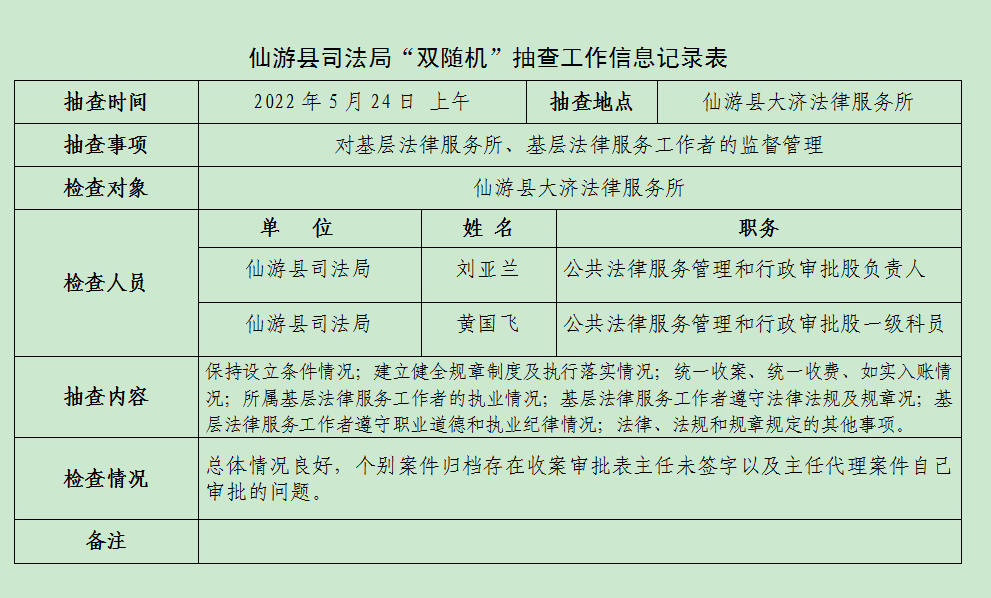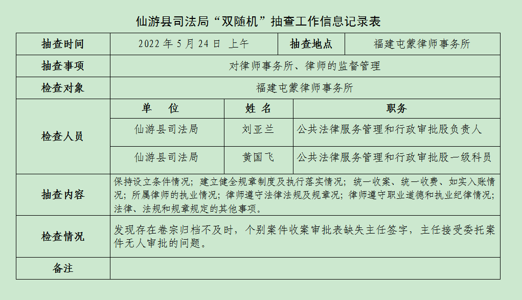 根据《仙游县司法局2018年“双随机”抽查实施方案》(仙司〔2018〕7号)文件精神,县司法局按照“双随机”原则抽签确定检查人员和检查对象,于5月24日上午组织局工作人员对福建屯蒙律师事务所上半年的内部管理及法律律师执业情况进行随机抽查,采取实地查看、查阅档案资料等方法,检查结果是:该所按照能《律师事务所管理办法》相关要求,规范执业,但发现其存在卷宗归档不及时,个别案件收案审批表缺失主任签字,主任接受委托案件无人审批的问题。于5月24日上午对仙游县大济法律服务所2022年上半年的内部管理及法律服务工作者执业情况进行全面检查,检查结果是:该所按照能《基层法律服务所管理办法》相关要求,规范执业,总体情况良好,个别案件归档存在收案审批表主任未签字以及主任代理案件自己审批的问题。