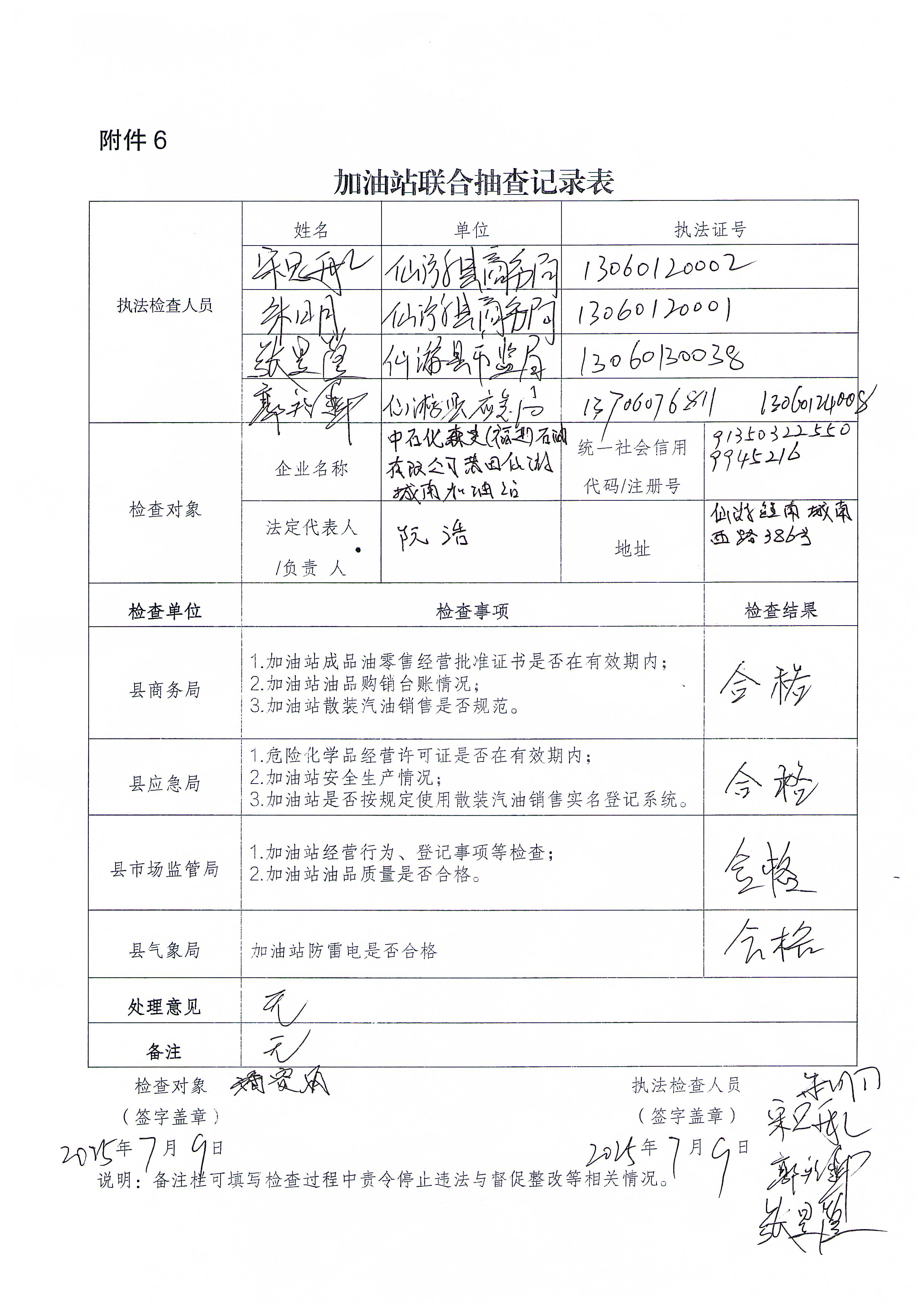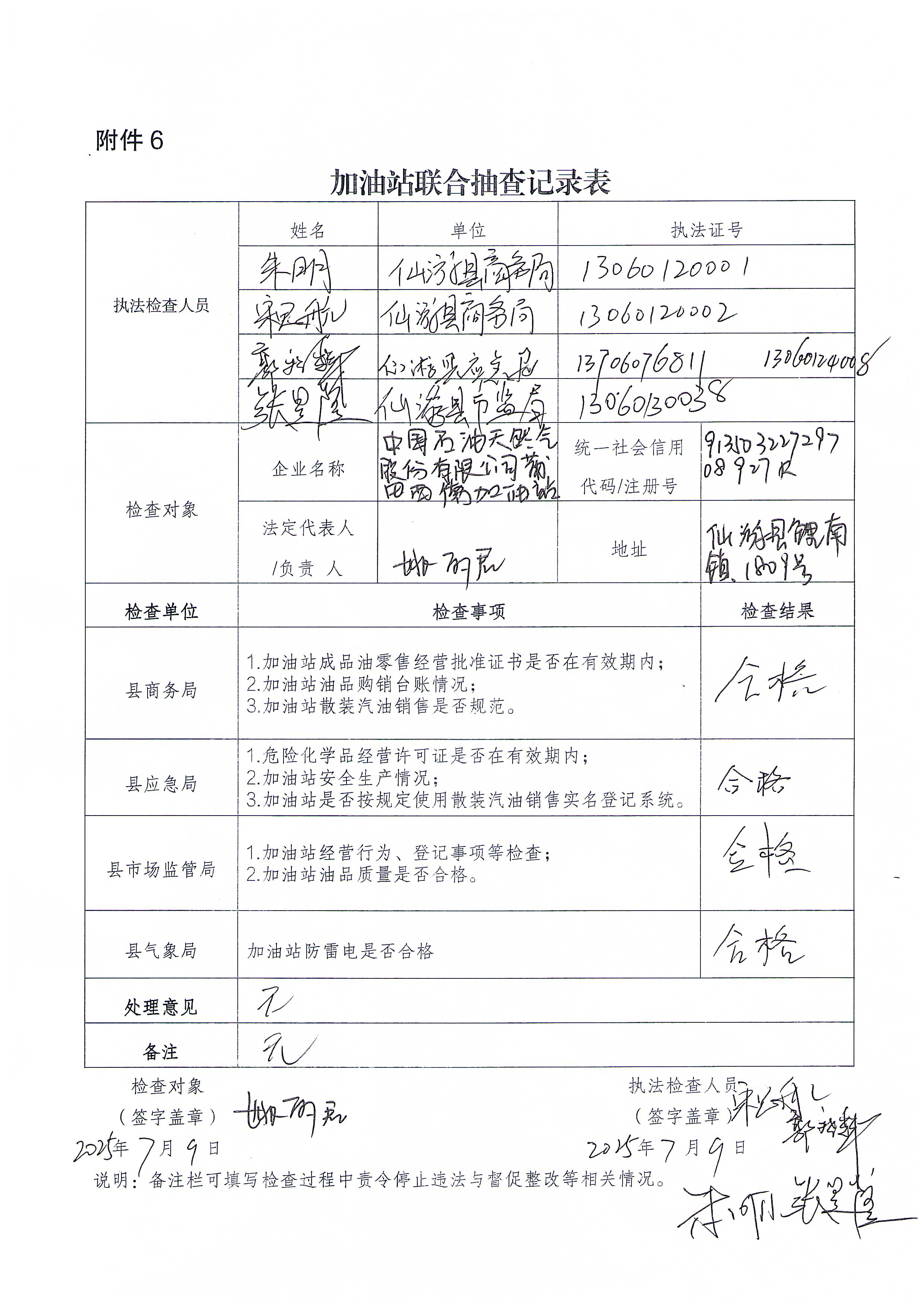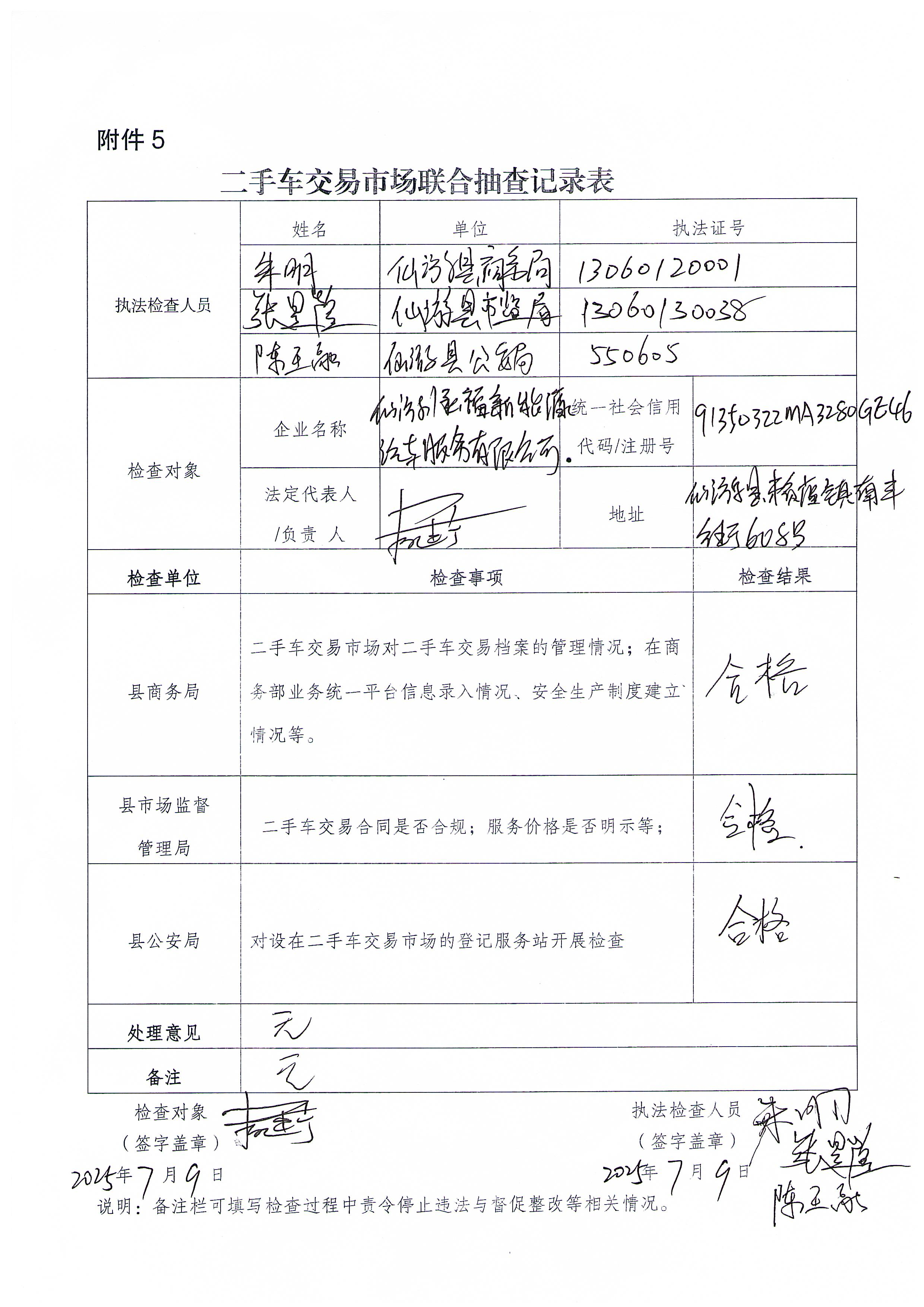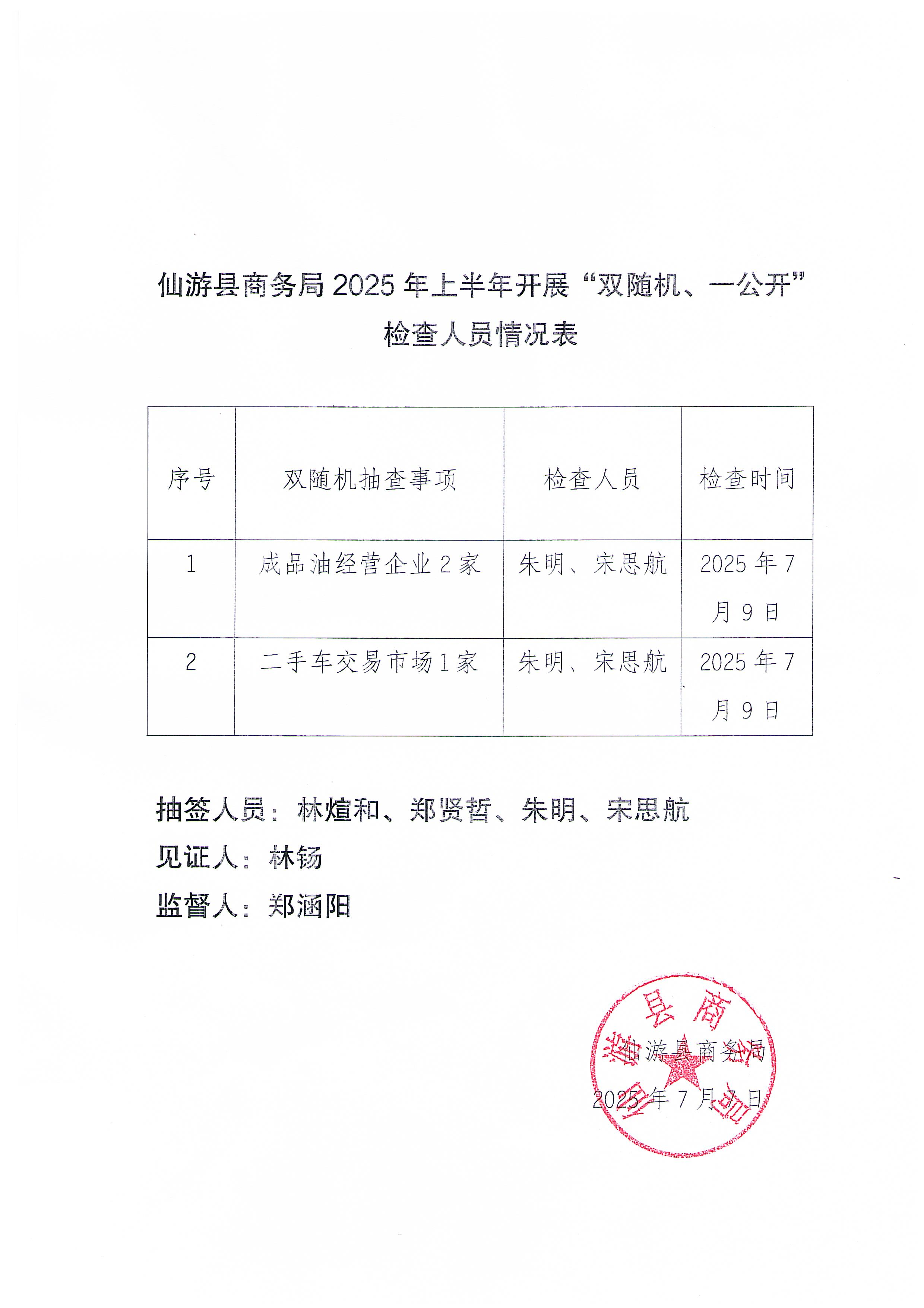 根据《福建省“双随机、一公开”跨部门联合监管工作联席会议办公室关于印发2025年全省“双随机、一公开”跨部门联合监管工作要点的通知》(闽市监信〔2025〕136号)和《莆田市市场监督管理局关于贯彻落实2025年全省“双随机、一公开”跨部门联合监管工作要点的通知》(莆市监信〔2025〕109号),我局按照不低于5%的比例从《仙游县商务局市场主体随机抽查名录库》中随机抽取监管对象,再从《仙游县商务局执法检查人员名录库》中随机抽取2名检查人员,联合县市场监督管理局、县公安局、县应急局开展跨部门执法检查。我局于2025年7月9日开展“成品油经营企业监管”事项双随机抽查工作1次,抽查成品油零售经营企业2家,分别是中石化城南加油站(鲤南镇),中石油西德加油站(鲤南镇);开展“二手车交易市场监管”事项双随机抽查工作1次,抽查二手车交易市场1家,为仙游涵福新能源汽车服务有限公司。