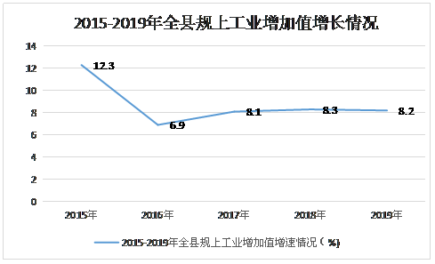 2019年,全县规模以上工业增加值增长8.2%。从近五年增长情况看,2015-2019年,全县规模以上工业增加值增速分别达12.3%、6.9%、8.1%、8.3%、8.2%。从增长趋势分析,2015年是增长高点,2016年由于红木产业的颓势增速放缓,而近三年全县工业经济已逐渐恢复动能,趋向平稳增长。