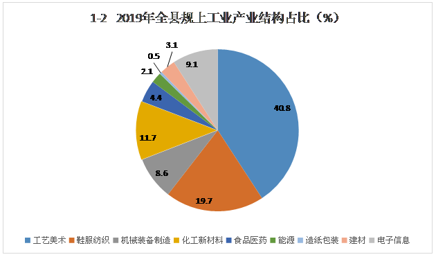 (一)主导产业挑大梁。2019年,工艺美术、鞋服纺织、机械装备制造、化工新材料四大主导产业增加值增长4.2%,占全县规上工业增加值80.9%,对全县规上工业增加值增长的贡献率达54.5%,拉动全县规上工业增加值增长6.6个百分点。
