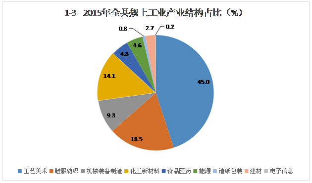 从产业结构来看,2019年,全县规上工业九大产业结构占比对比2015年变化较为明显(详见表1-3、1-4)。其中,主导产业工艺美术、化工新材料机械装备制造、占比较2015年分别下降4.2个、2.4个、0.7个百分点,电子信息业、鞋服纺织占比较2015年分别上升8.8个、1.2个百分点,以电子信息业为代表的新动能产业结构上升转变明显。