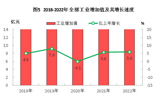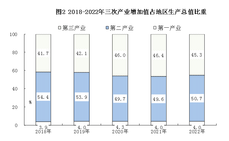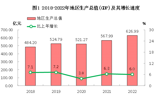 初步核算,全年实现地区生产总值626.99亿元,比上年增长6.0%。其中,第一产业增加值24.90亿元,增长6.4%;第二产业增加值318.25亿元,增长6.9%;第三产业增加值283.84亿元,增长5.1%。三次产业增加值占地区生产总值的比重,第一产业为4.0%,第二产业为50.7%,第三产业为45.3%。全年人均地区生产总值69242元,比上年增长6.2%。