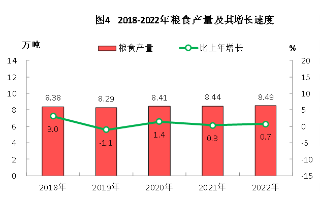 全年农林牧渔业完成总产值46.77亿元,比上年增长7.3%。粮食种植面积13.68千公顷,比上年增加0.09 千公顷。粮食产量8.49万吨,比上年增加0.06万吨,增长0.7%。其中,稻谷产量6.85万吨,增加40吨,增长0.1%。