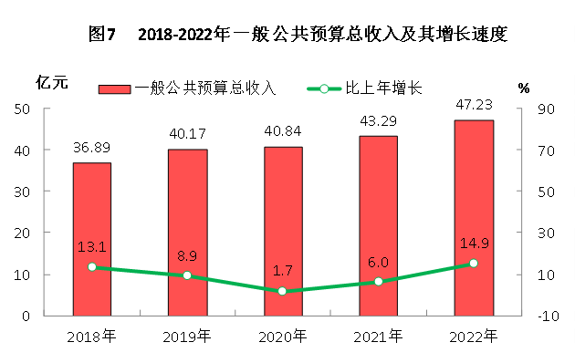 全年一般公共预算总收入47.23亿元,扣除留抵退税因素后比上年增长14.0%,其中,地方一般公共预算收入29.65亿元,扣除留抵退税因素后增长14.9%;一般公共预算支出65.31亿元,增长19.2%。