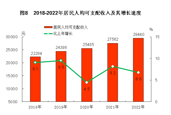 全年全县居民人均可支配收入29440元,比上年增长6.8%。按常住地分,农村居民人均可支配收入22418元,增长8.6%;城镇居民人均可支配收入40098元,增长5.9%。城乡居民人均可支配收入比值1.79,比上年缩小0.04。