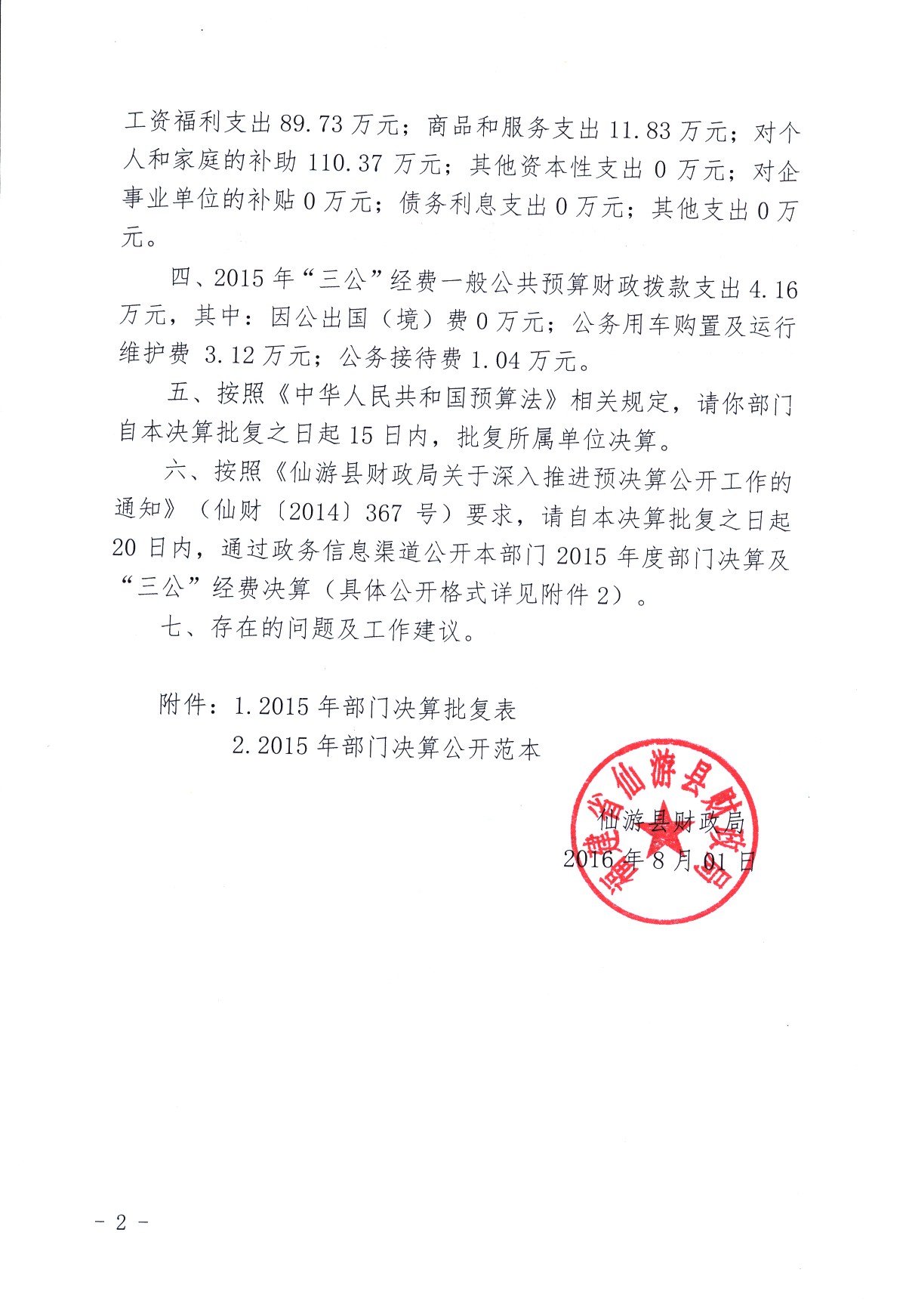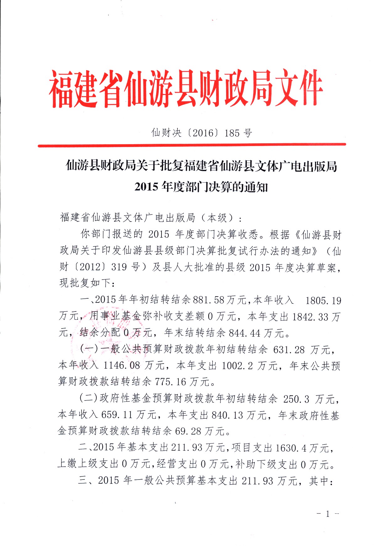 按照《仙游县财政局关于深入推进预决算公开工作的通知》(仙财﹝2014﹞367号)要求以及《仙游县财政局关于批复仙游县文体广电出版局2015年度部门决算的通知》(仙财决〔2016〕185号)的批复,现将我单位2015年度部门决算说明如下: