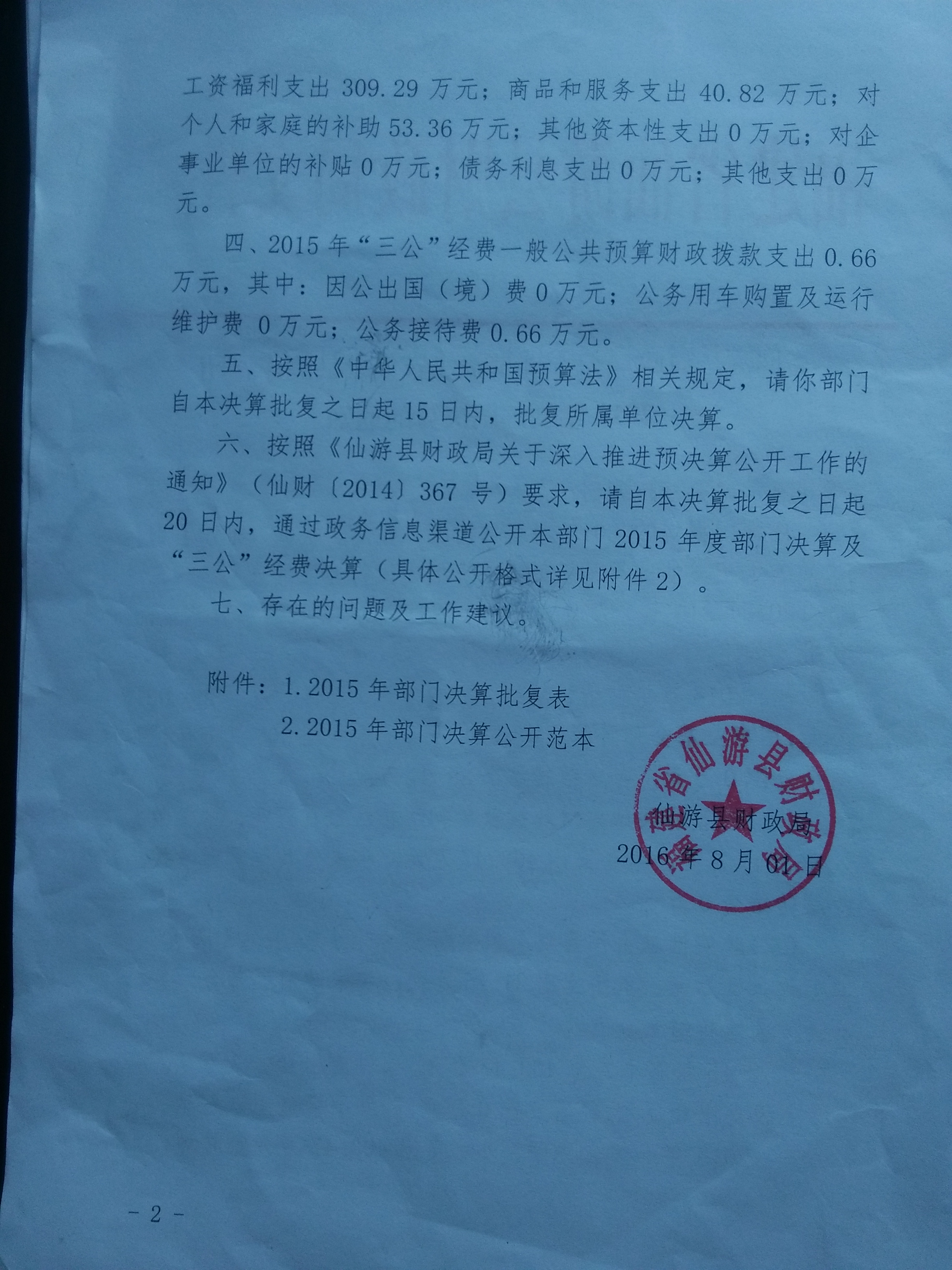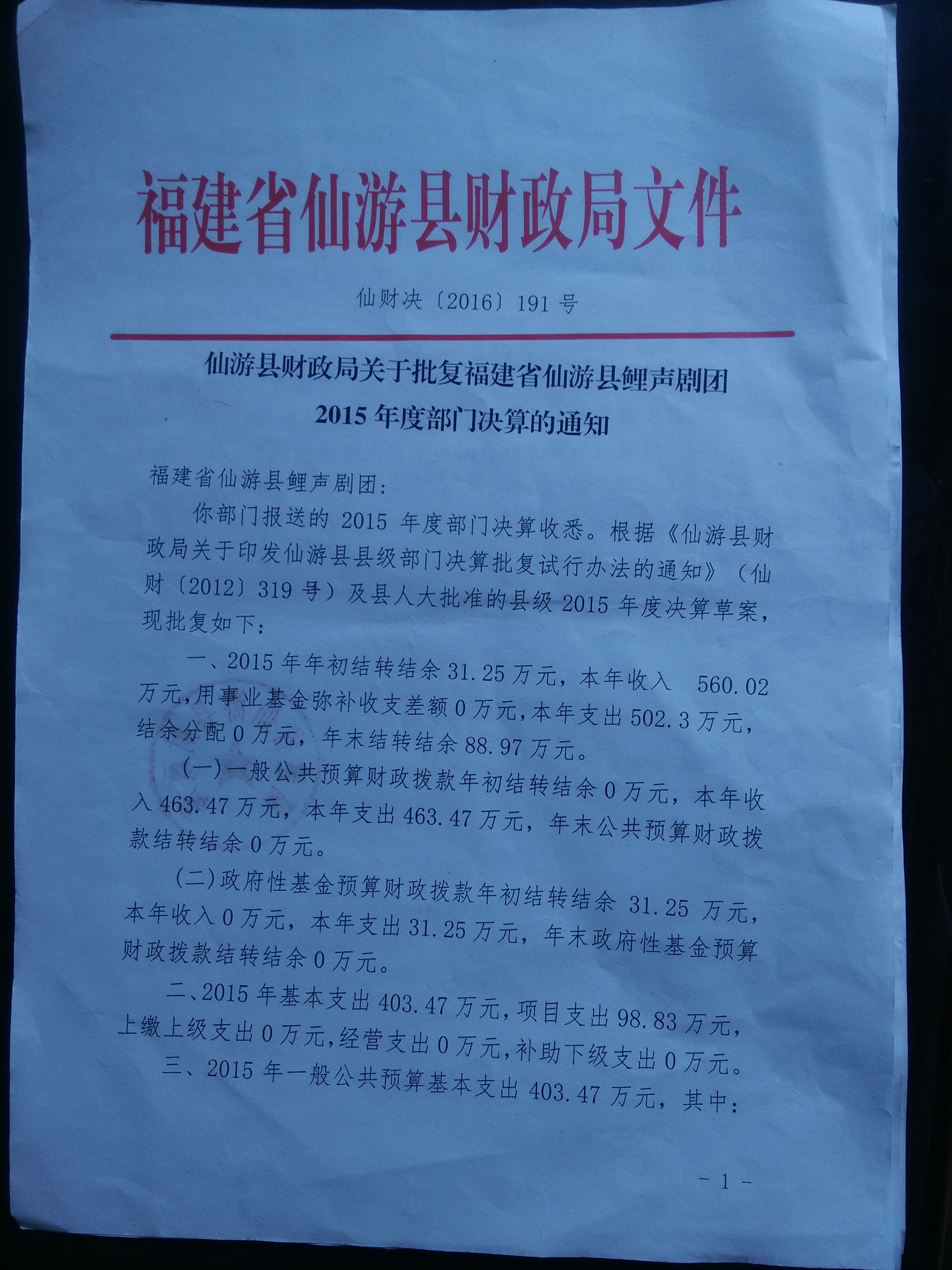 按照《仙游县财政局关于深入推进预决算公开工作的通知》(仙财﹝2014﹞367号)要求以及《仙游县财政局关于批复仙游县莆仙戏鲤声艺术传承保护中心2015年度部门决算的通知》(仙财决〔2016〕191 号)的批复,现将我单位2015年度部门决算说明如下: