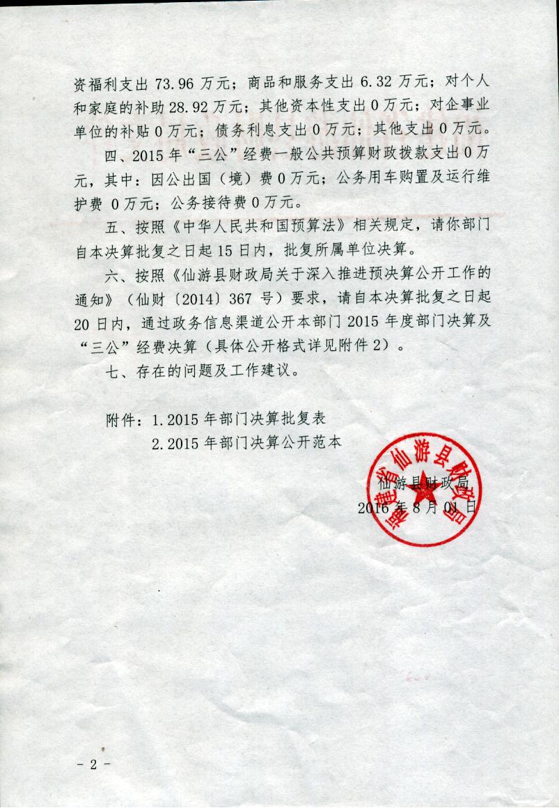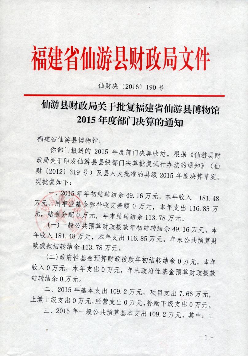按照《仙游县财政局关于深入推进预决算公开工作的通知》(仙财﹝2014﹞367号)要求以及《仙游县财政局关于批复仙游县博物馆2015年度部门决算的通知》(仙财决〔2016〕190 号)的批复,现将我单位2015年度部门决算说明如下: