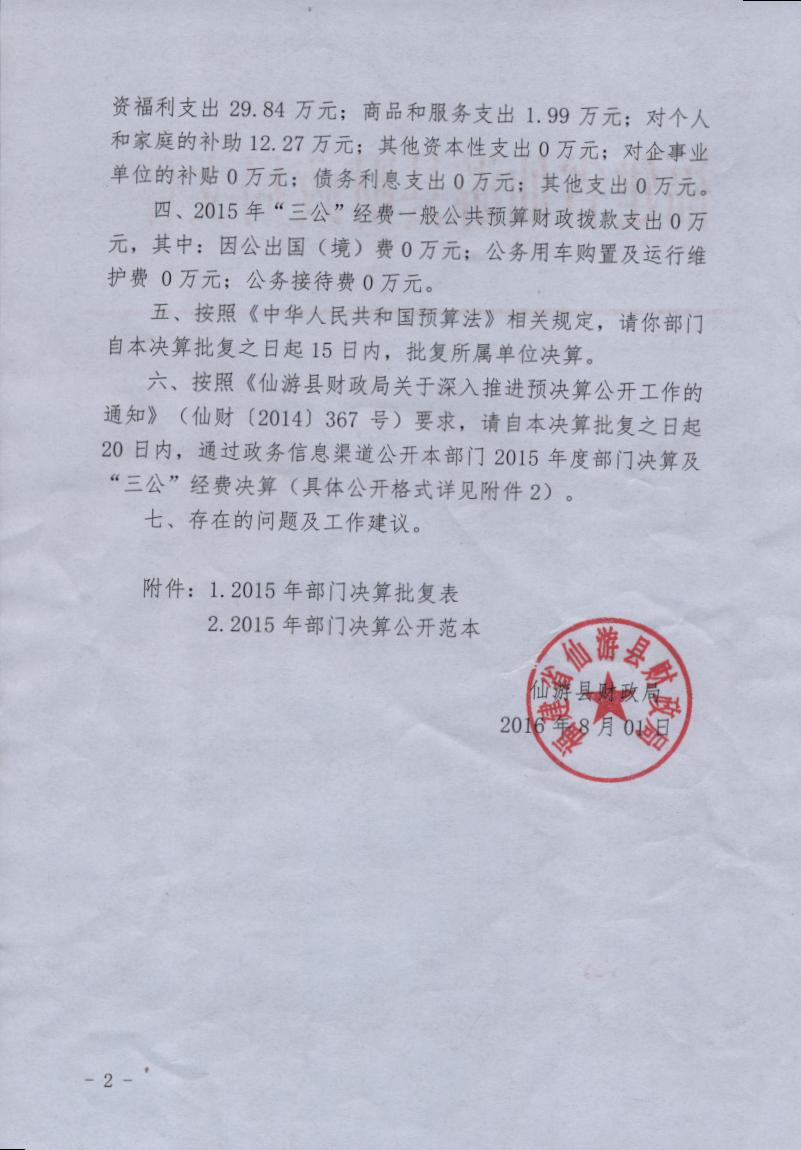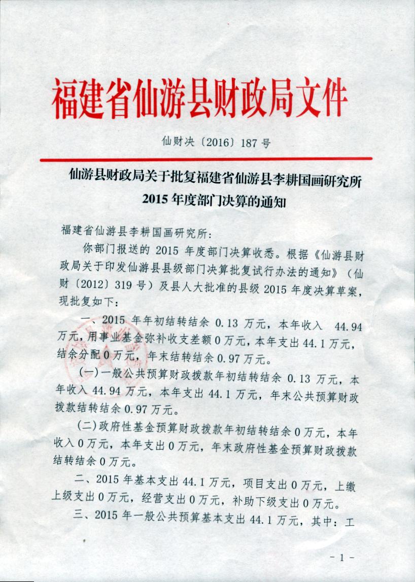 按照《仙游县财政局关于深入推进预决算公开工作的通知》(仙财﹝2014﹞367号)要求以及《仙游县财政局关于批复县李耕国画研究所2015年度部门决算的通知》(仙财决〔2016〕187 号)的批复,现将我单位2015年度部门决算说明如下: