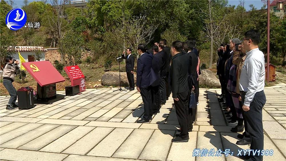 “我志愿加入中国共产党,拥护党的纲领,遵守党的章程……”春光融融,草木菁菁。上午十点二十分,在仙游境内第一个党支部——中共仙游上宫支部旧址广场前,党员领导们高举右手,面向党旗整齐列队,发出铿锵有力的宣誓,重温入党誓词。