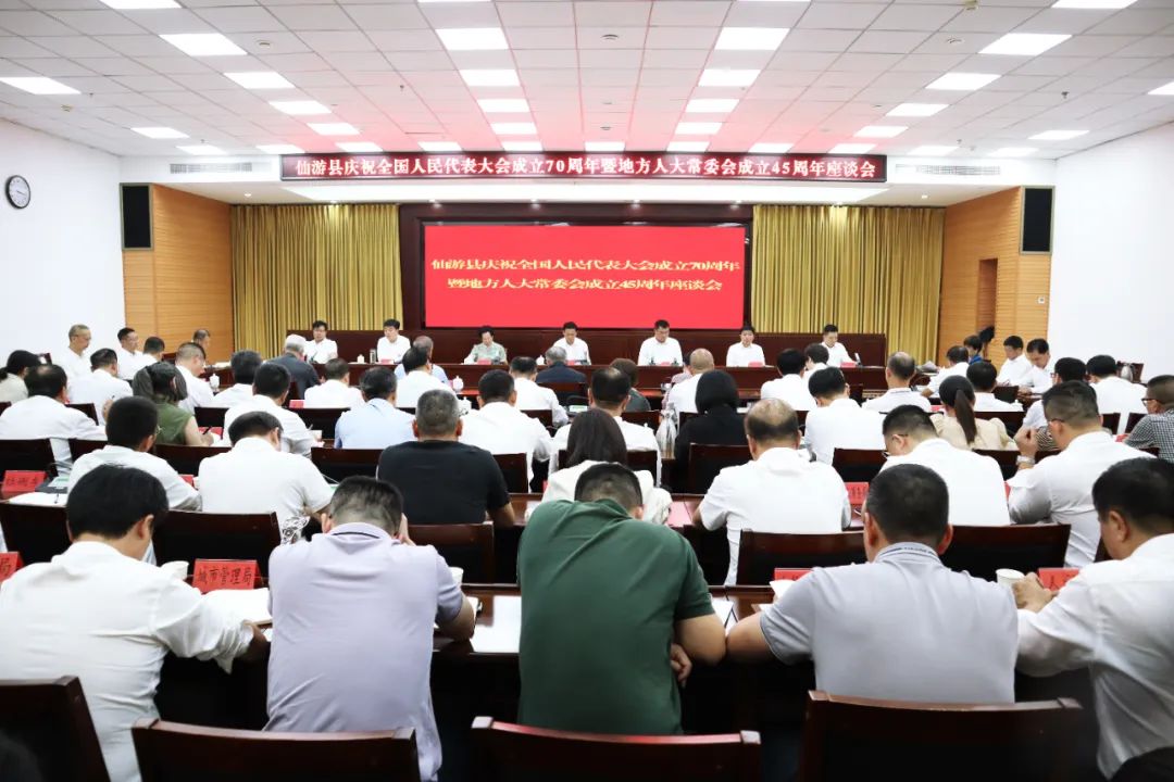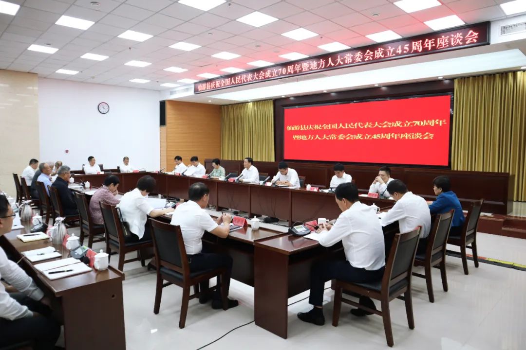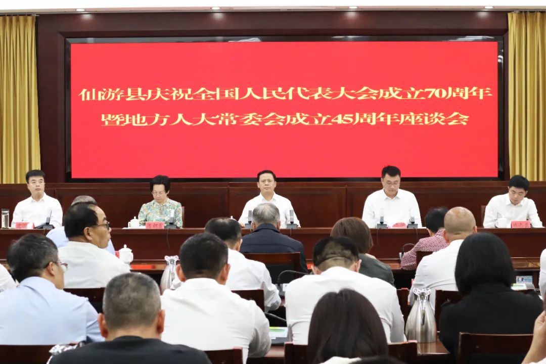 仙游报道10月30日讯(郑文洁 文/图)10月29日,仙游县庆祝全国人民代表大会成立70周年暨地方人大常委会成立45周年座谈会召开,主要任务是深入学习贯彻习近平总书记关于坚持和完善人民代表大会制度的重要思想,全面学习领会习近平总书记在庆祝全国人民代表大会成立70周年大会上的重要讲话精神,认真贯彻落实全省全市有关工作会议精神,总结我县人大工作的成就和经验,丰富和拓展全过程人民民主人大实践,为“加快融合发展、打造美丽仙游”提供有力保障。县委书记吴文恩主持会议并讲话,县长陈志挺,县人大常委会主任陈朝霞,县政协主席林志良,县委副书记沈国林等领导参加会议。