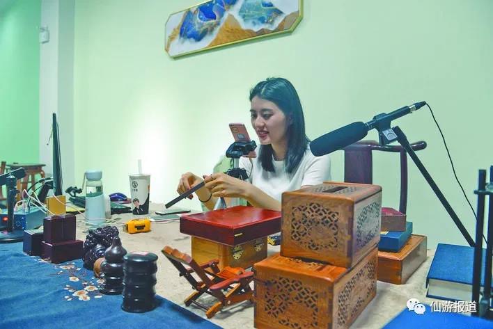走进艺雕智慧产业园的天猫(仙游)直播基地,在聚光灯的映衬下,十余名网红主播在各自直播间,通过淘宝平台直播卖力展示,现场向全国网友推介红木工艺品,线上反响热烈、互动连连,接到不少的订单。