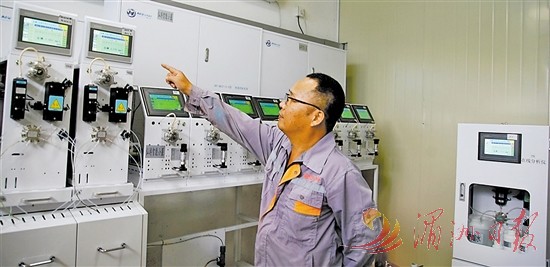 图为污水厂工作人员在AI智能小屋监控预测系统。