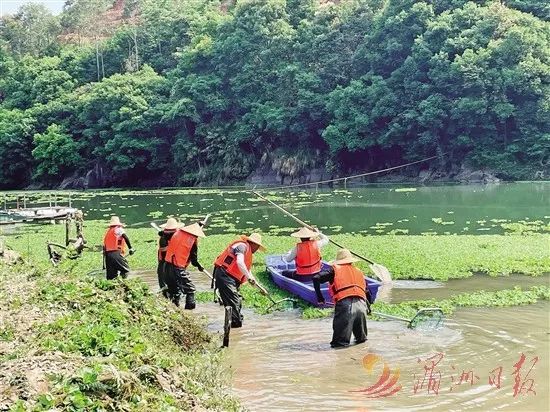 两地河长办共同派员清理粗溪河道水浮莲。李娟/摄