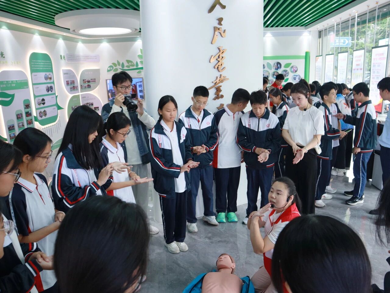 揭牌仪式后,与会人员参观了驿站内部设施及供电公司“爱国爱企 担当作为”教育基地。驿站内功能分区明确,氛围温馨,既有法治宣传角、心理辅导室,也有阅读活动区,充分体现了“服务就在身边”的便民理念。教育基地由原仙游发电厂老厂房改造,内部完整保留了曾经的3台发电机组等老物件,私立一中八年级学生代表们通过实地参观、讲解介绍,进一步了解我县电力发展史。此外,学生们还参与了急救知识学习、心理健康测评等互动环节,现场气氛活跃,反响热烈。