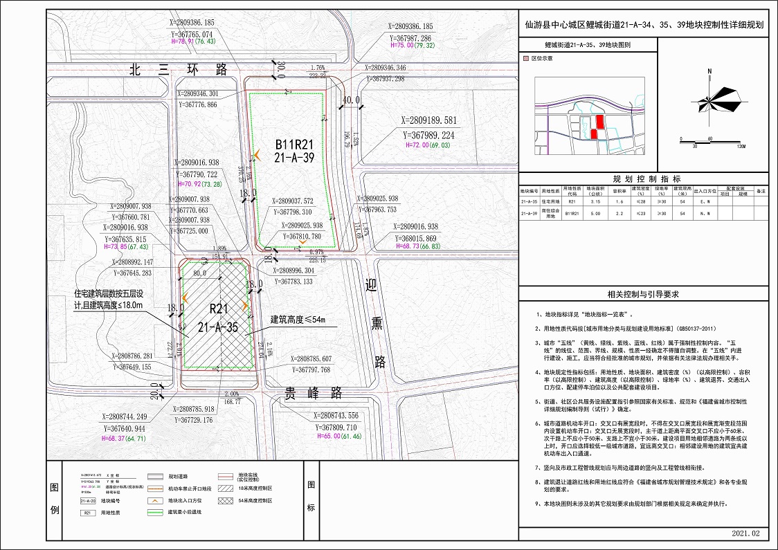 350322-21-A-35地块位于仙游县鲤城街道,东至规划路,西至规划路,南邻贵峰路,北至规划路。用地性质为住宅用地及服务设施用地,地块面积31543.97㎡。350322-21-A-39地块位于仙游县鲤城街道,东至迎熏路,西至规划路,南至规划路,北至北三环路。用地性质为商住用地及服务设施用地,地块面积49979.34㎡。