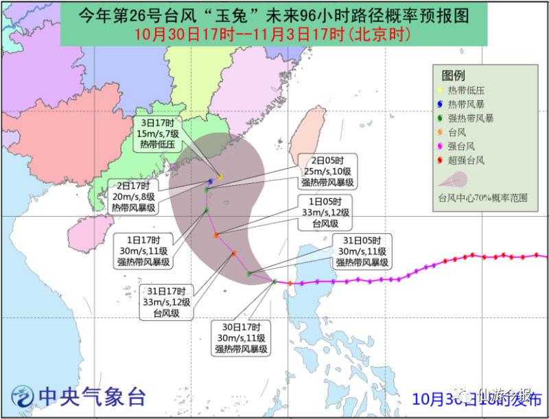 今年第26号台风“玉兔”30日11时中心位于北纬16.7度、东经120.7度,近中心最大风力14级以上(42米/秒,强台风级),中心最低气压955百帕。预计“玉兔”将以每小时15~20公里的速度向偏西方向移动,强度略有减弱。