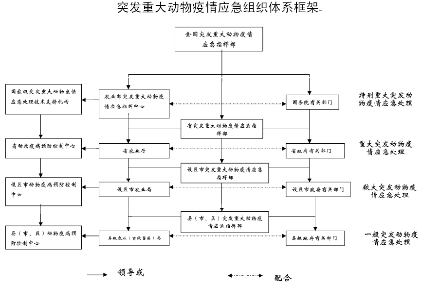 1.5.1 统一领导,分级管理。县人民政府统一领导和指挥突发重大动物疫情应急处理工作;疫情应急处理工作实行属地管理;各乡镇政府(街道办事处)负责扑灭本行政区域内的突发重大动物疫情,各有关部门按照预案规定,在各自的职责范围内做好重大动物疫情应急处理的有关工作。根据突发重大动物疫情的范围、性质和危害程度,对突发重大动物疫情实行分级管理。