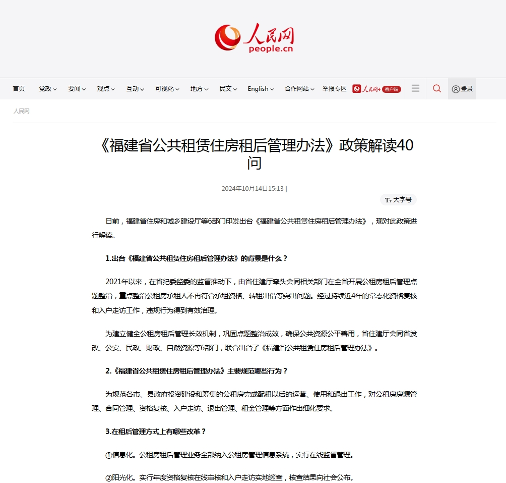 为建立健全公租房租后管理长效机制,巩固点题整治成效,确保公共资源公平善用,省住建厅会同省发改、公安、民政、财政、自然资源等6部门,联合出台了《福建省公共租赁住房租后管理办法》。