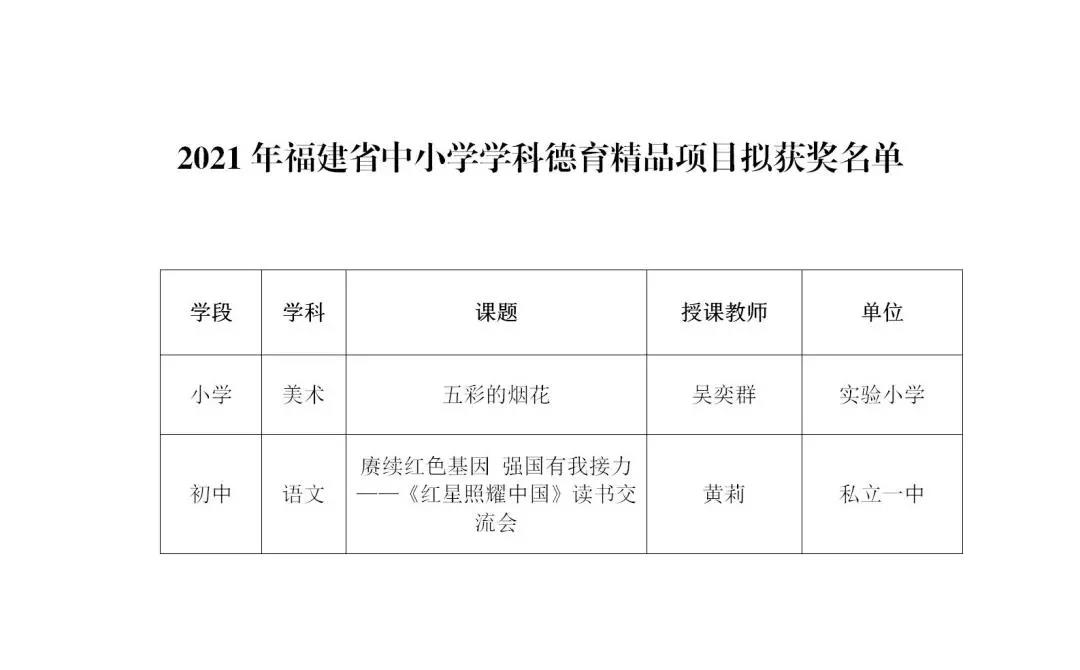 根据《福建省教育厅办公室关于组织开展中小学学科德育精品项目遴选活动的通知》(闽教办基〔2021〕19号),在各设区市遴选推荐的基础上,经委托省普教室组织专家评审,拟确定100个“2021福建省中小学学科德育精品项目”获奖名单(详见附件),现予以公示,公示期内,如有不同意见,可来电、来信反映。